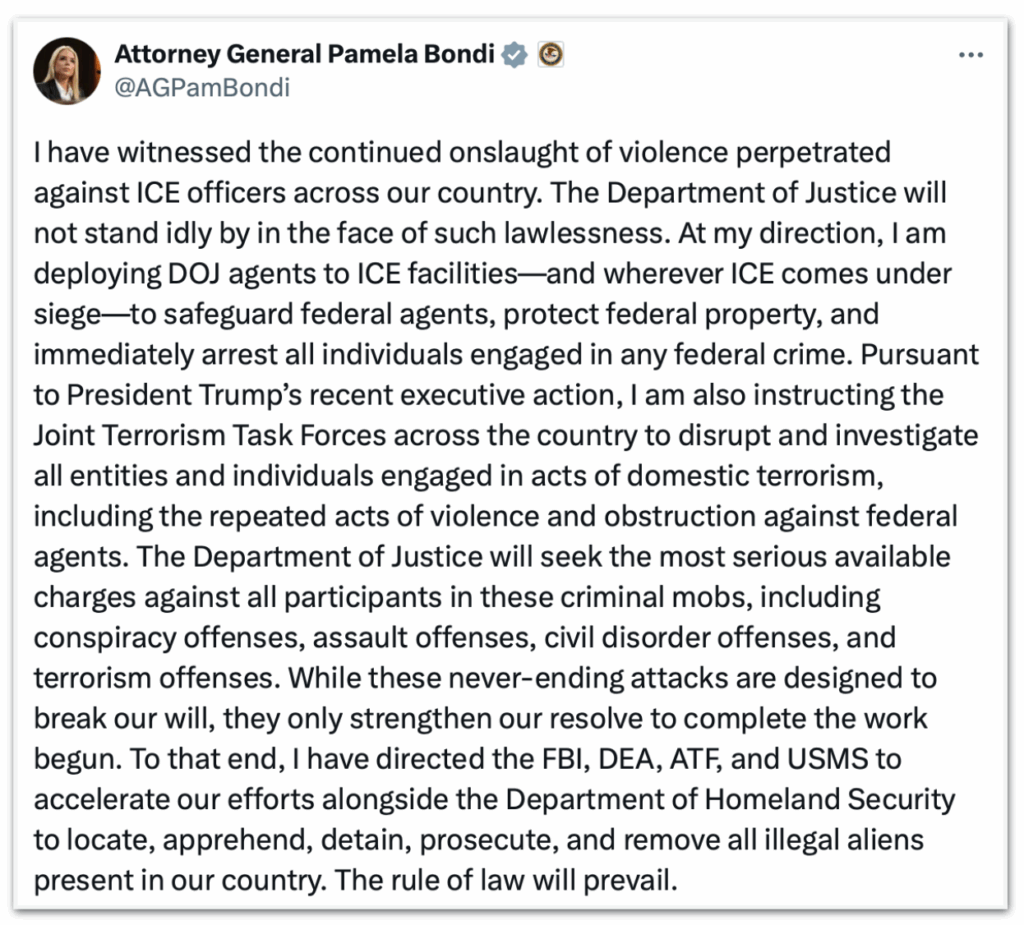 A procuradora-geral disse que, seguindo ordens do presidente dos EUA, Donald Trump (Partido Republicano), vai instruir as forças-tarefa de combate ao terrorismo em todo o país “a interromper e investigar todas as entidades e indivíduos envolvidos em atos de terrorismo doméstico, incluindo os repetidos atos de violência e obstrução contra agentes federais”.