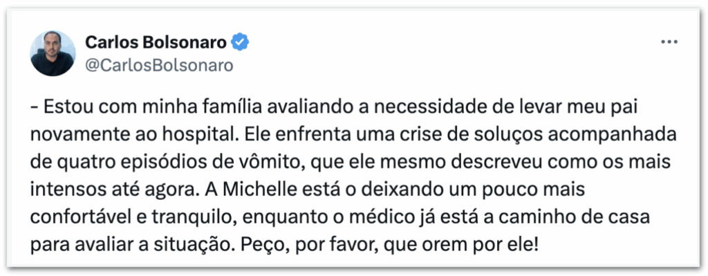 Horas antes, o vereador Carlos Bolsonaro (PL-RJ) havia afirmado no seu perfil no X que a família avaliava levar o ex-presidente ao hospital em razão de uma crise de soluços “acompanhada de 4 episódios de vômito”.