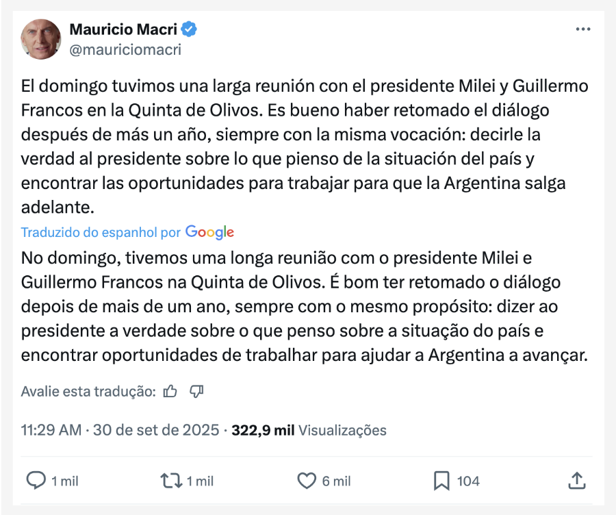 O ex-presidente apoiou a candidatura de Milei nas eleições de 2023, mas, a partir de então, a relação dos 2 ficou estremecida: Macri foi escanteado do governo que ajudou a eleger. Ao longo do mandato de Milei, os políticos trocaram críticas por meio de declarações à imprensa argentina.