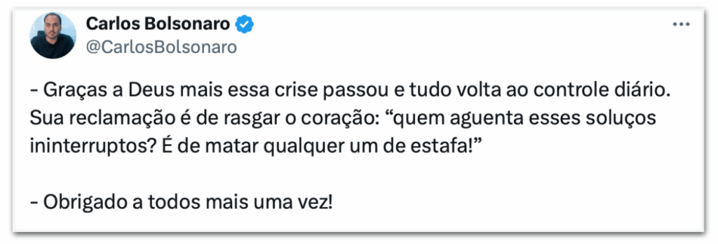 Mais cedo, Carlos havia publicado no X que a família avaliava a necessidade de levar Bolsonaro ao hospital por causa de uma crise de soluços acompanhada de 4 episódios de vômito. Segundo o vereador, eram os “mais intensos”.