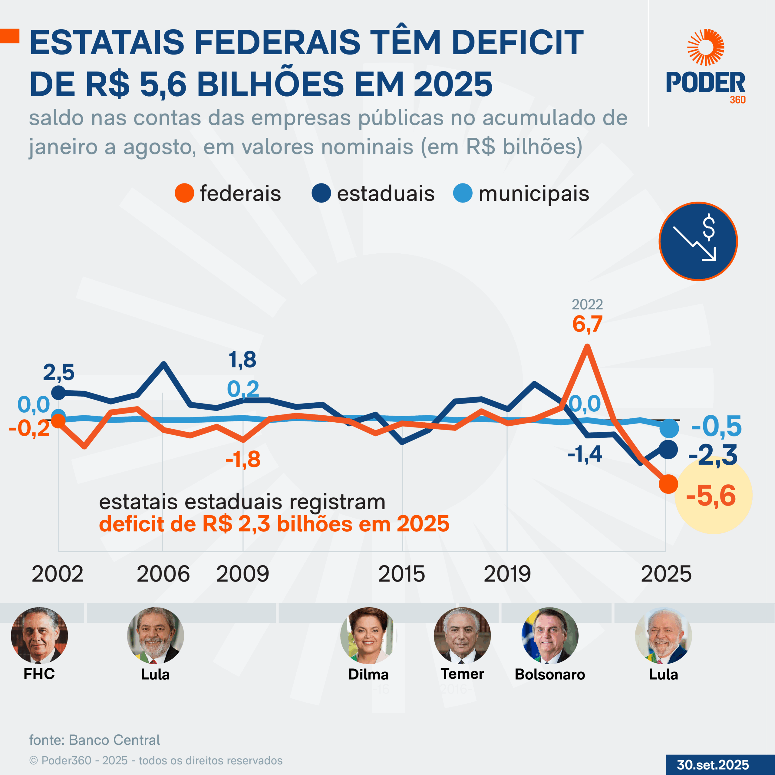 As estatais federais tiveram deficit de R$ 5,6 bilhões no acumulado de janeiro a agosto. Esse foi o maior saldo negativo para o período da série histórica, iniciada em 2002. O BC (Banco Central) divulgou o relatório “Estatísticas Fiscais” nesta 3ª feira (30.set.2025). Eis a íntegra (PDF – 273 kB).