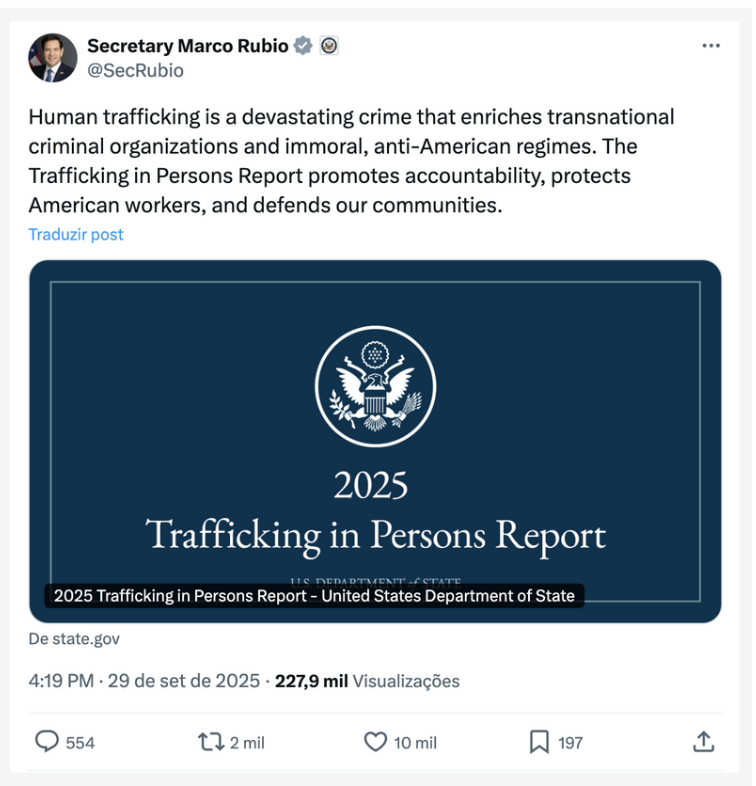 Em publicação no X, o secretário de Estado dos EUA, Marco Rubio, declarou: “O tráfico humano é um crime horrível e devastador que também enriquece organizações criminosas transnacionais e regimes imorais e antiamericanos”.