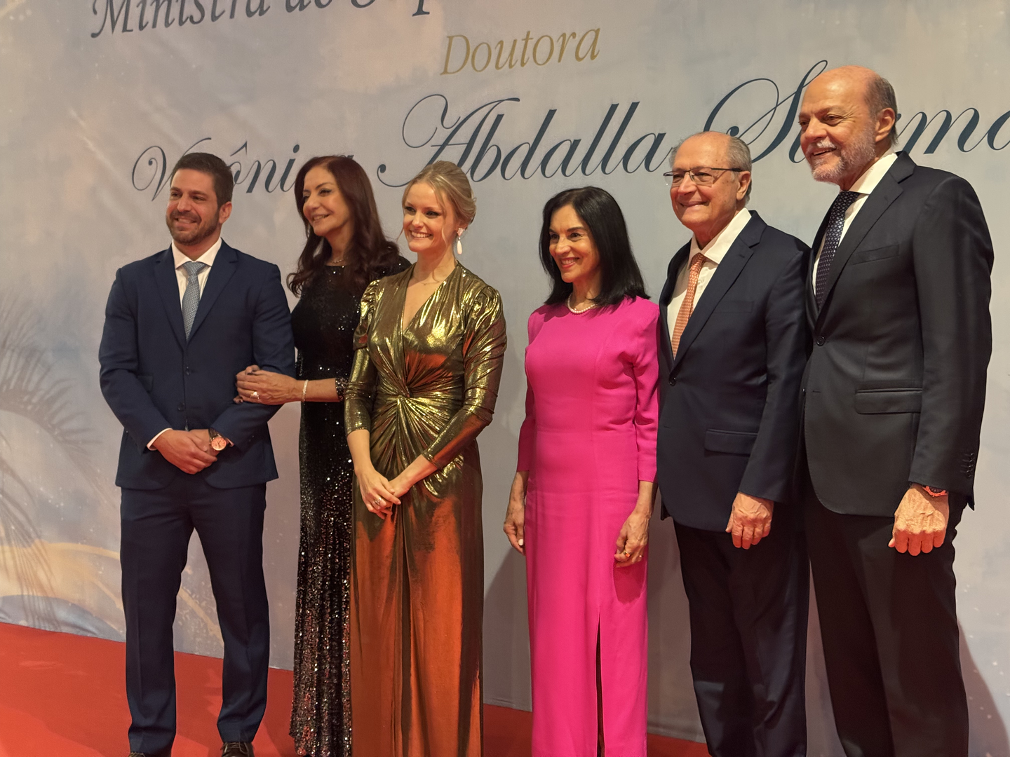 Verônica Sterman (de vestido dourado) com Lu Alckmin (de vestido rosa) e Geraldo Alckmin (de gravata laranja)