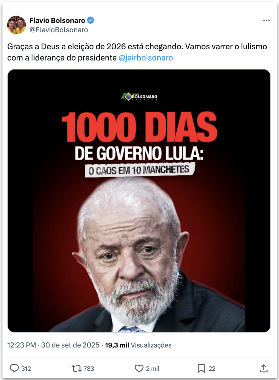O filho mais velho do ex-presidente Jair Bolsonaro (PL) publicou um vídeo com títulos de reportagens de jornais. As manchetes falam em piora na degradação da Amazônia Legal, aumento de deficit nominal no acumulado de 12 meses em julho deste ano e alta do preço do ovo no 1º semestre de 2025.