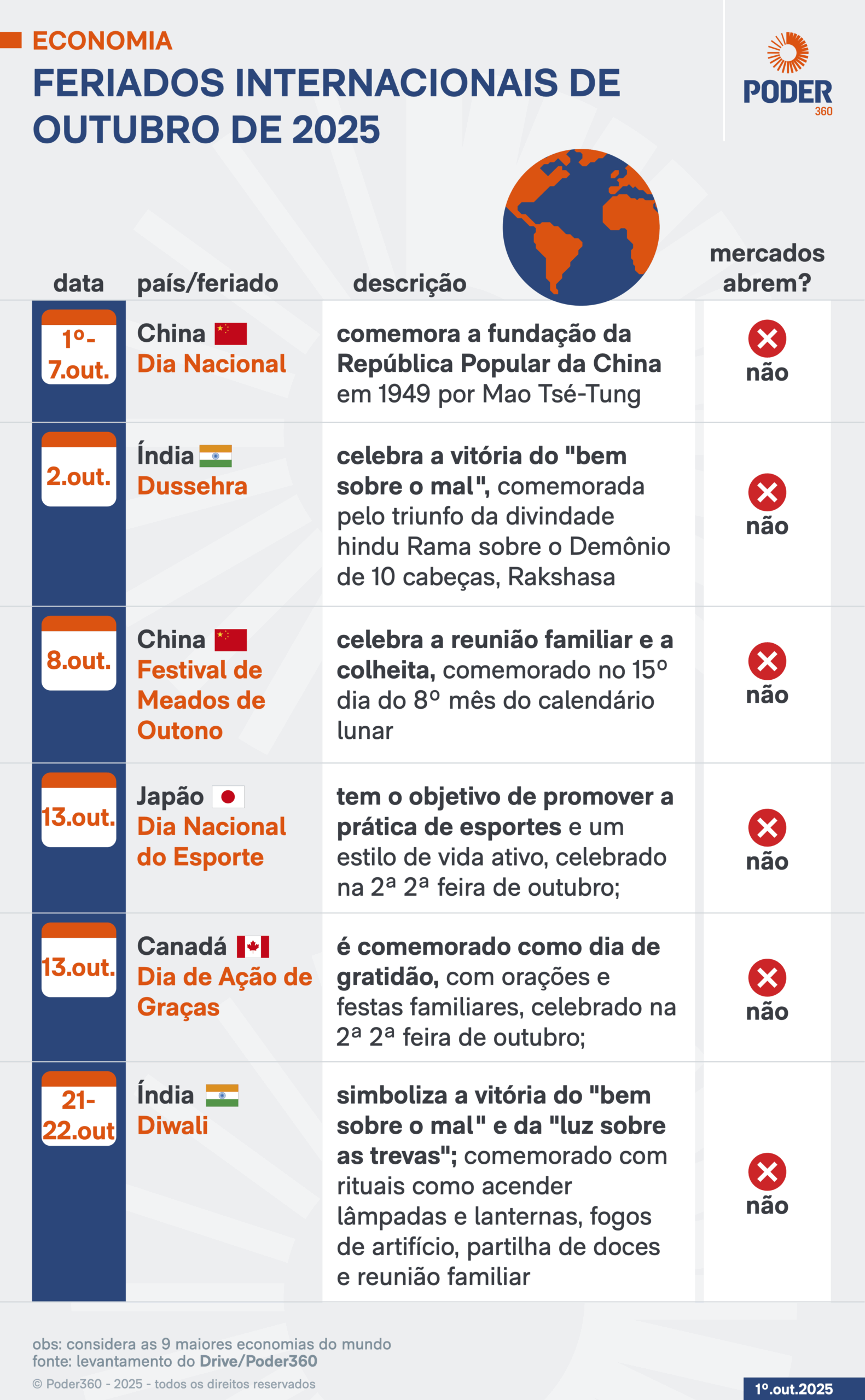 Nesta 3ª feira (1º.out.2025), a China celebra o Dia Nacional, data que marca a fundação da República Popular da China em 1949 por Mao Tsé Tung. Já em 8 de outubro, o país comemora o Festival de Meados de Outono. A data é celebrada na 2ª 2ª feira do 8º mês do calendário lunar. Comemora a reunião familiar e a colheita.