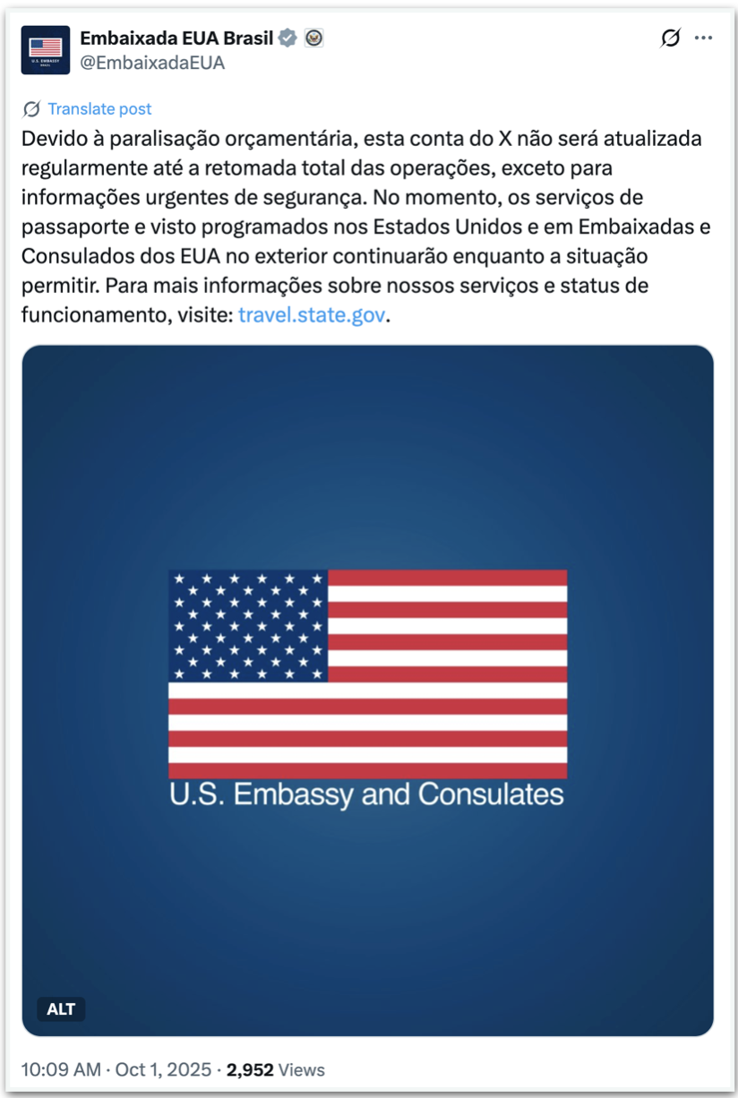 Apesar da redução nas atualizações, a embaixada informou que os serviços de passaporte e de visto, tanto em território norte-americano quanto nas embaixadas e consulados dos EUA no exterior, continuam funcionando “enquanto a situação permitir”.