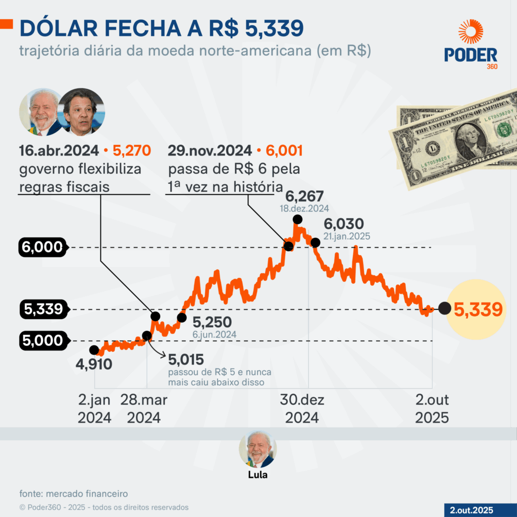 O dólar comercial fechou nesta 5ª feira (2.out.2025) a R$ 5,339. A cotação da moeda norte-americana registrou alta diária de 0,20%. É o 3º dia seguido que a divisa sobe frente ao real.