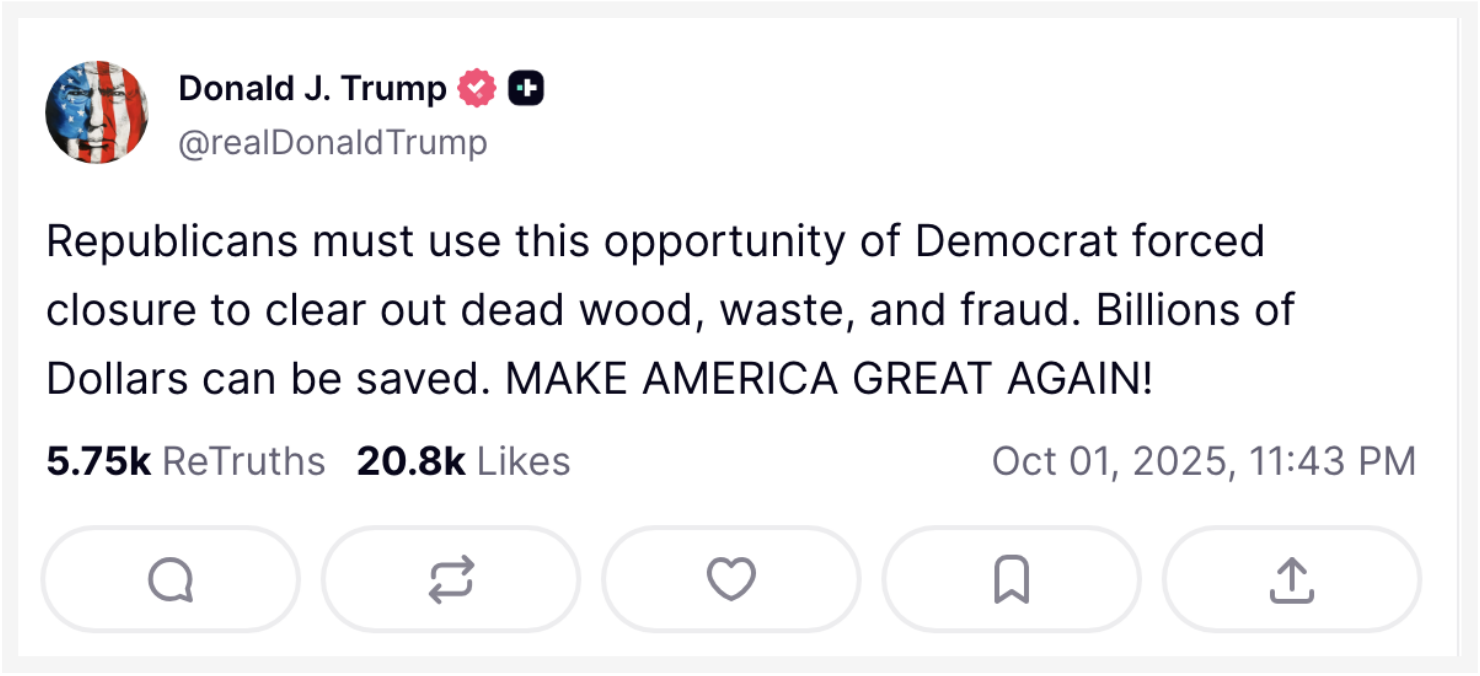 “Republicanos devem aproveitar esta oportunidade de fechamento forçado pelos democratas para eliminar a estagnação, o desperdício e a fraude. Bilhões de dólares podem ser economizados. Façam a América grande novamente!”