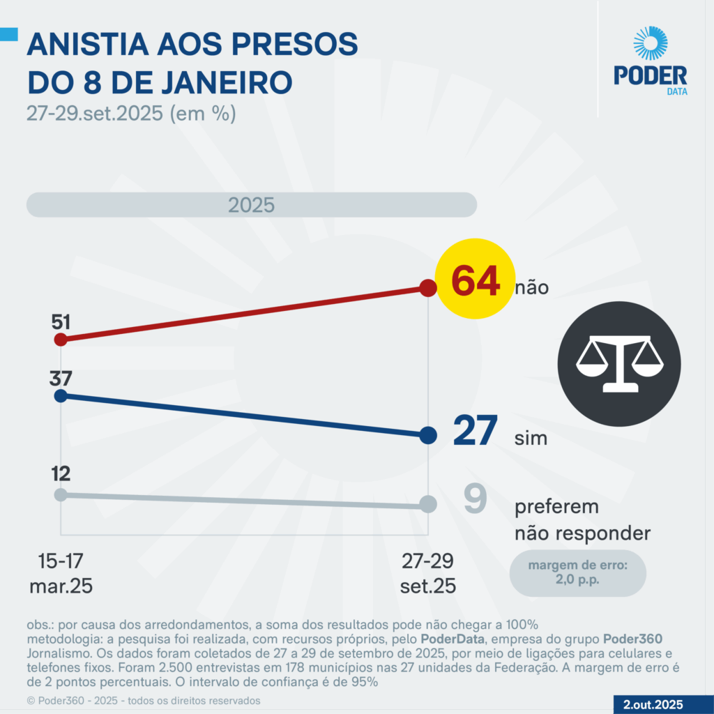 A pesquisa foi realizada pelo PoderData, empresa do grupo Poder360 Jornalismo, com recursos próprios. Os dados foram coletados de 27 a 29 de setembro de 2025, por meio de ligações para celulares e telefones fixos. Foram 2.500 entrevistas em 178 municípios nas 27 unidades da Federação. A margem de erro é de 2 pontos percentuais. O intervalo de confiança é de 95%.