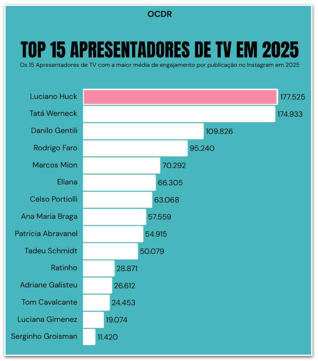Os dados são do ranking divulgado pela Zeeng –empresa especializada em métricas digitais e acompanhamento de redes sociais que utiliza o auxílio de IA (Inteligência Artificial). O levantamento considera apenas apresentadores cuja atividade principal é comandar programas de TV e foram analisadas publicações feitas de 1º de janeiro a 1º de outubro em contas oficiais verificadas.