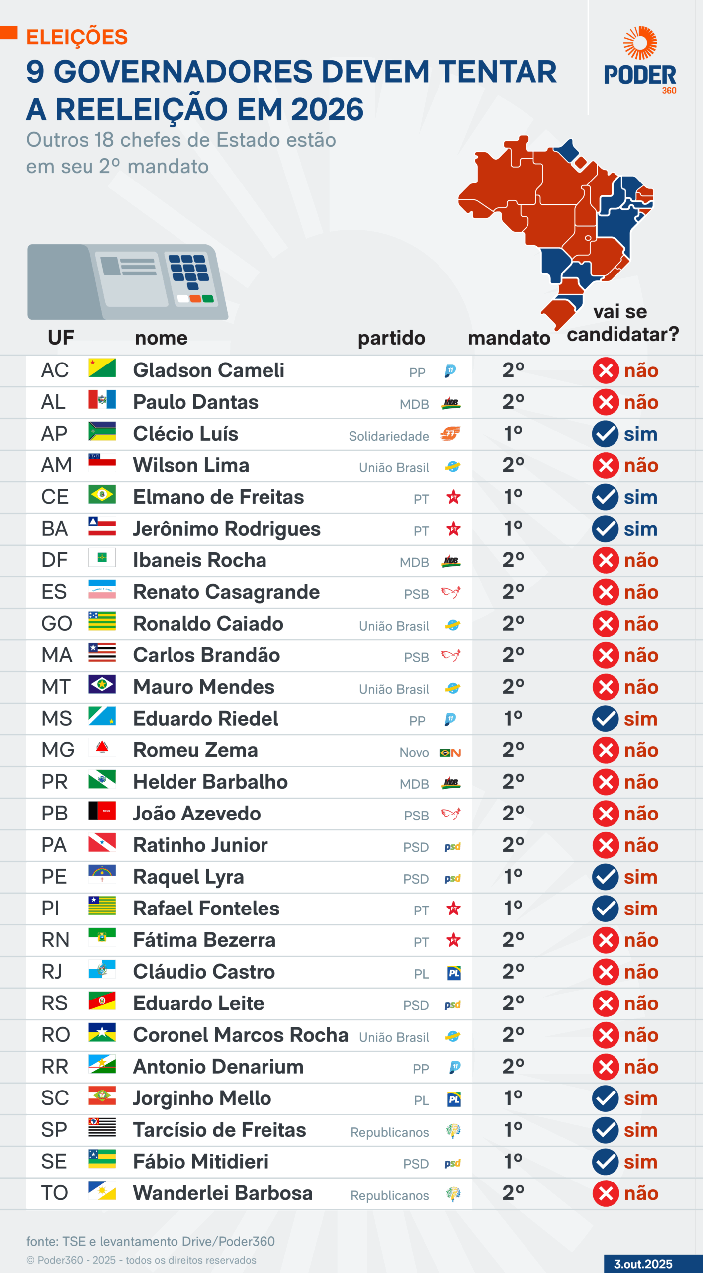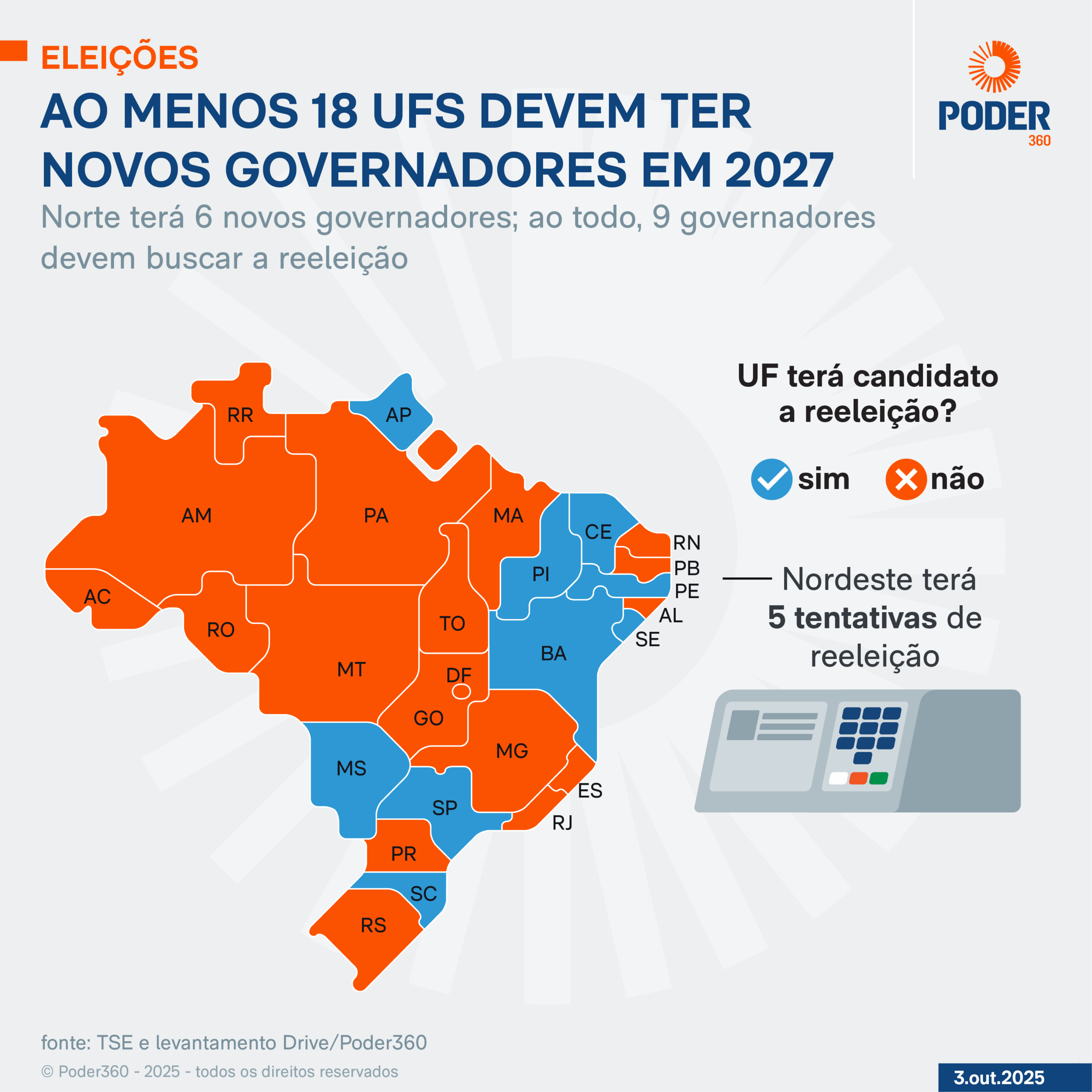 A 1 ano das eleições de 2026, 9 dos 27 governadores do país planejam disputar a reeleição, enquanto em 18 Estados haverá renovação obrigatória no comando do Executivo.