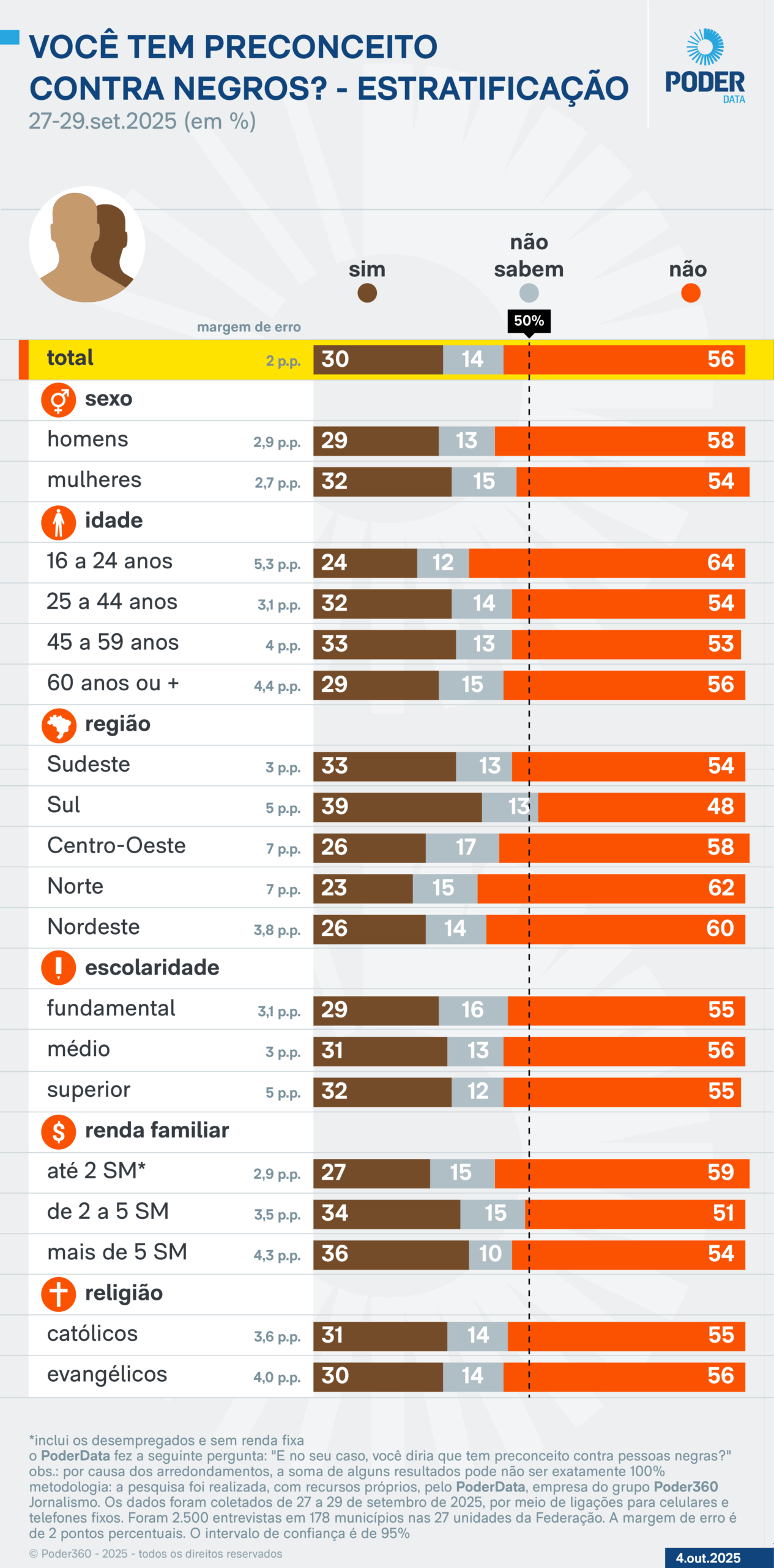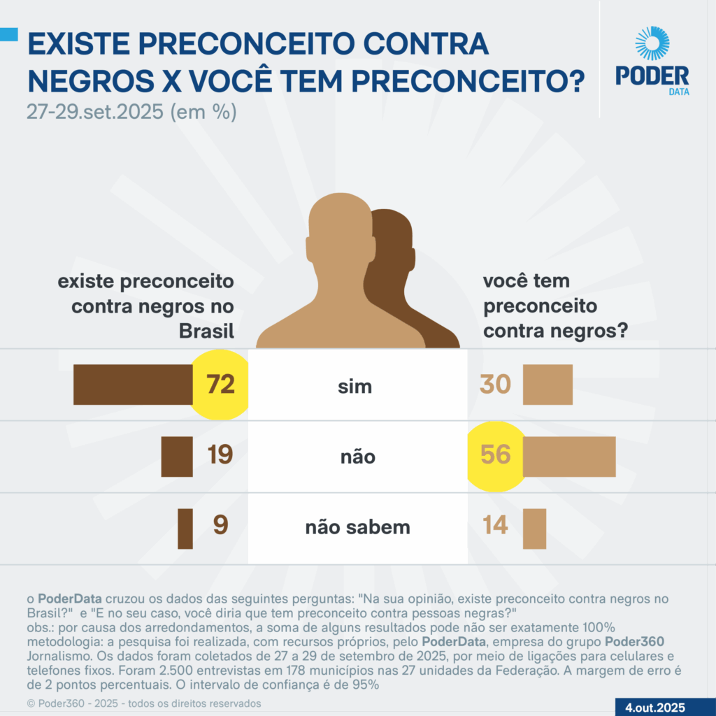 Já no grupo dos que respondem não existir preconceito contra negros no Brasil a pesquisa registrou pela 1ª vez uma diferença para além da margem de erro: a taxa subiu 5 pontos percentuais em 1 ano. Eram 14% em outubro de 2024. Agora, são 19%.
