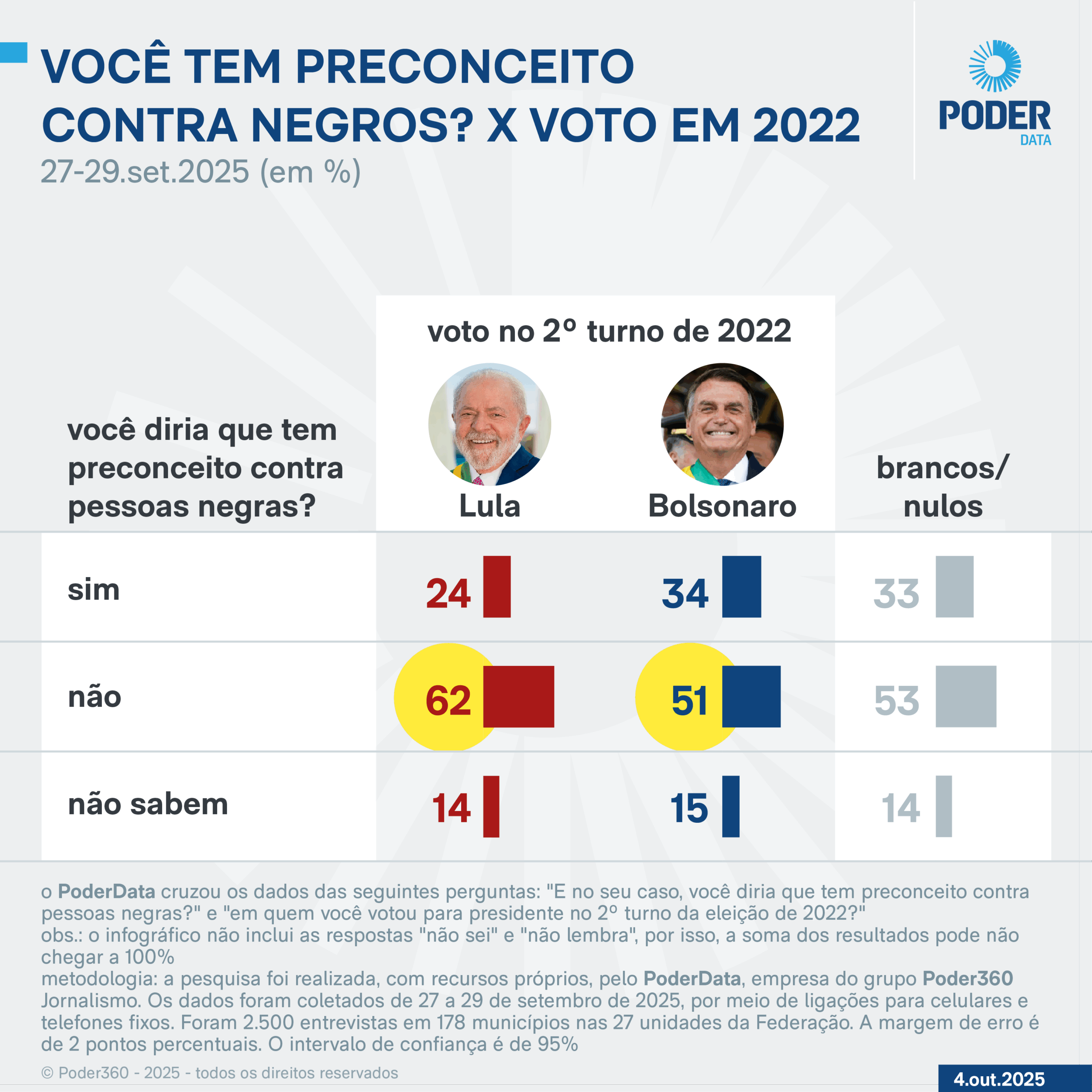 O PoderData cruzou os dados sobre preconceito com a declaração de voto dos entrevistados no 2º turno de 2022. Dentre os eleitores do presidente Luiz Inácio Lula da Silva (PT), a taxa dos que dizem existir preconceito contra negros no Brasil é mais alta do que dentre os que afirmam ter votado no ex-presidente Jair Bolsonaro (PL): 74% X 66%.