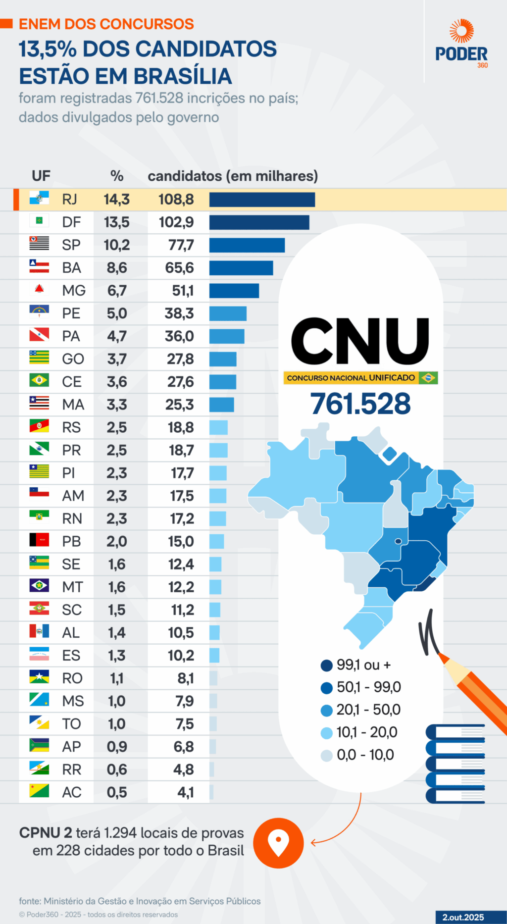 O Distrito Federal concentra 13,5% dos inscritos no 2º CNU (Concurso Público Nacional Unificado), conhecido como Enem dos concursos. São 102,9 mil candidatos apenas em Brasília, segundo dados do Ministério da Gestão e da Inovação em Serviços Públicos. A capital federal fica atrás apenas do Rio de Janeiro, que reúne 108,8 mil inscritos (14,3% do total).