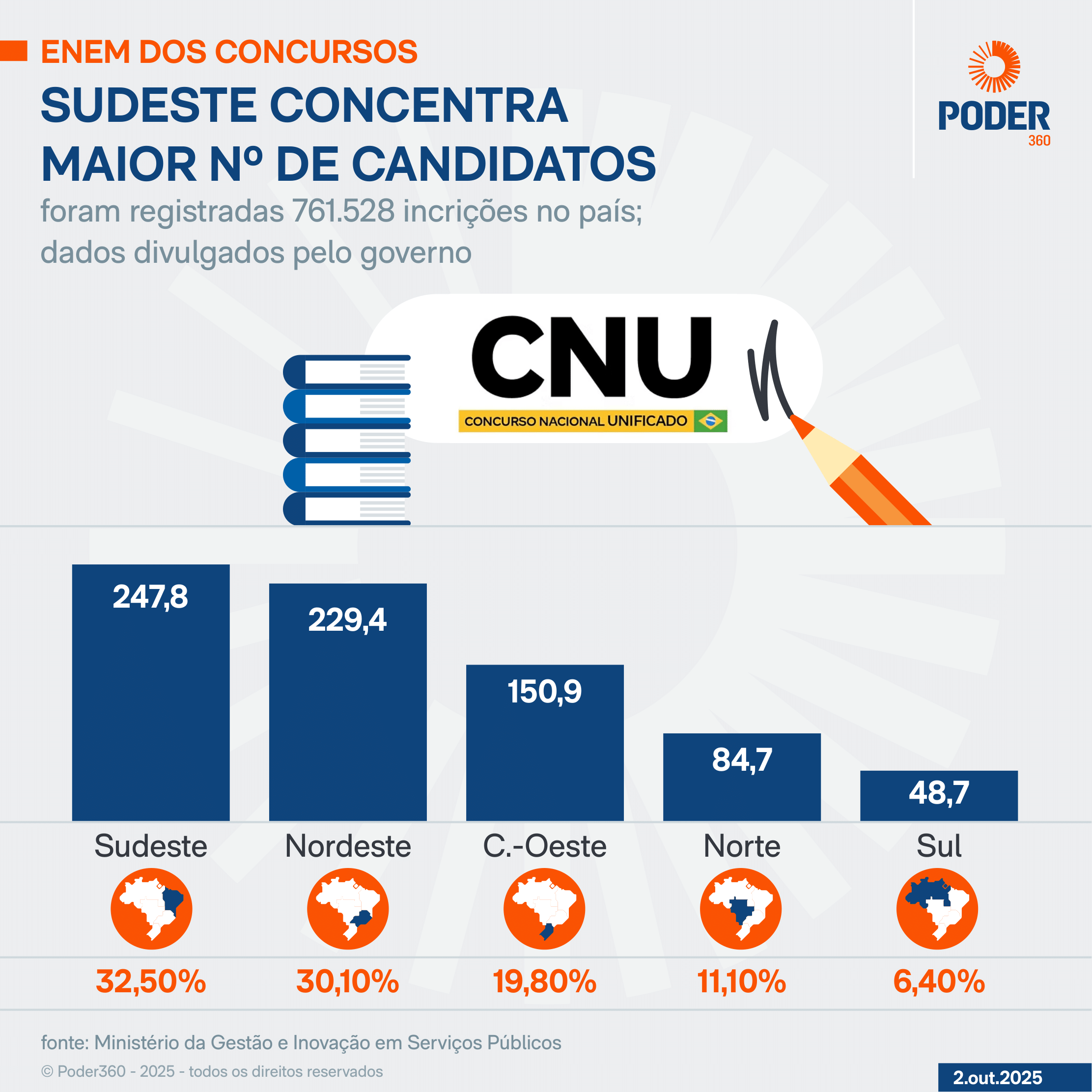 Ao todo, o CNU 2025 recebeu 761.528 inscrições para disputar 3.652 vagas em 32 órgãos federais. O número representa uma queda em relação à 1ª edição, em 2024, quando foram registrados 2,1 milhões de inscritos. As provas objetivas serão aplicadas neste domingo (5.out.2025) em 1.294 locais de prova espalhados por 228 cidades brasileiras.