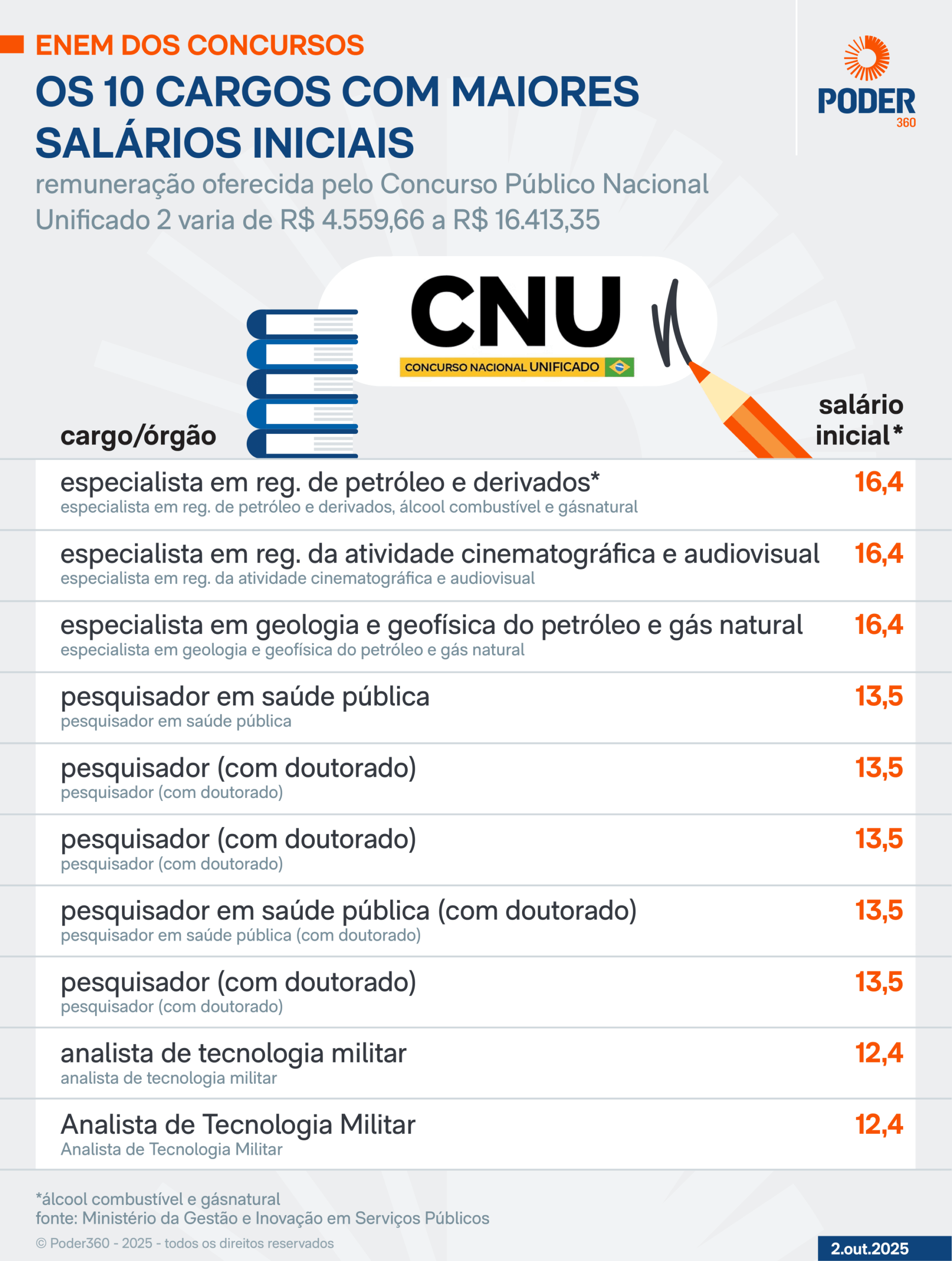 O CNU 2025 oferece salários iniciais que variam de R$ 4.500 a R$ 16,4 mil. Entre as 3.652 vagas abertas em 32 órgãos federais, os cargos de regulação em petróleo, audiovisual e geologia, além de pesquisadores com doutorado em saúde pública e ciências sociais, estão no topo da lista dos mais bem remunerados.
