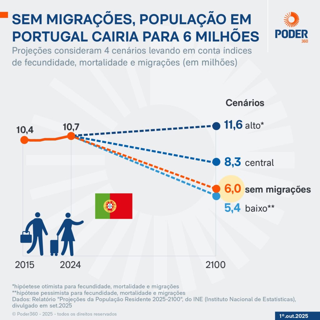 No cenário central, em 2100, a população idosa em Portugal aumentaria de 2,6 milhões em 2024 para 3,1 milhões. Já a PEA reduziria de 6,8 milhões em 2024 para 4,2 milhões em 2100.