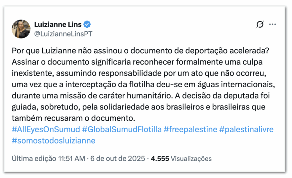 “A interceptação da flotilha deu-se em águas internacionais, durante uma missão de caráter humanitário. A decisão da deputada foi guiada, sobretudo, pela solidariedade aos brasileiros e brasileiras que também recusaram o documento”, diz a publicação.