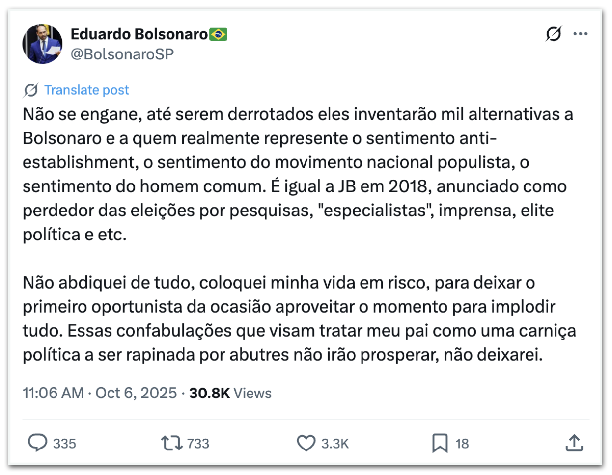 Segundo Eduardo, ele próprio “colocou a vida em risco” e não abriu mão de sua trajetória política para assistir a manobras que tratem Bolsonaro como “carniça política a ser rapinada por abutres”. Disse ainda que “essas confabulações não irão prosperar” e que seguirá atuando para preservar a liderança do ex-presidente no campo da direita.