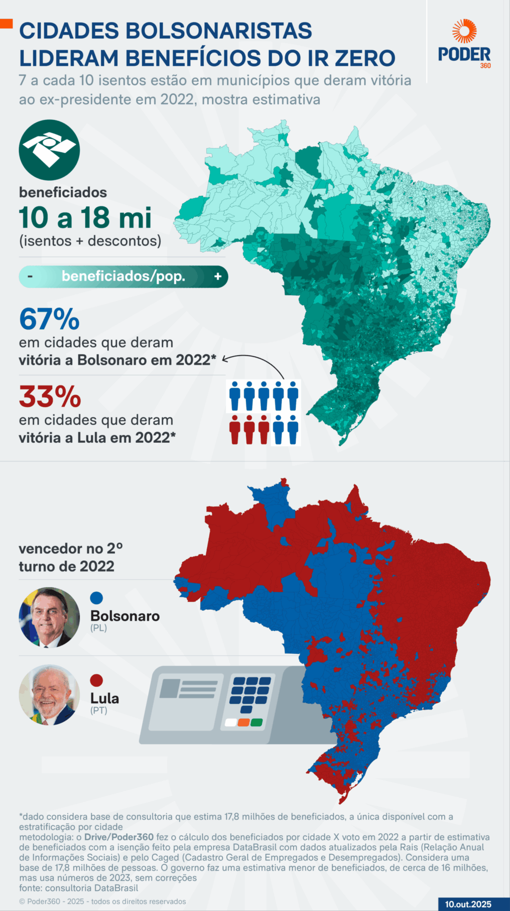 Como já mostrou o Poder360, a isenção beneficiará majoritariamente as regiões Sudeste e Sul –mais críticas à atual administração petista. Os mapas acima mostram graficamente como será esse impacto.
