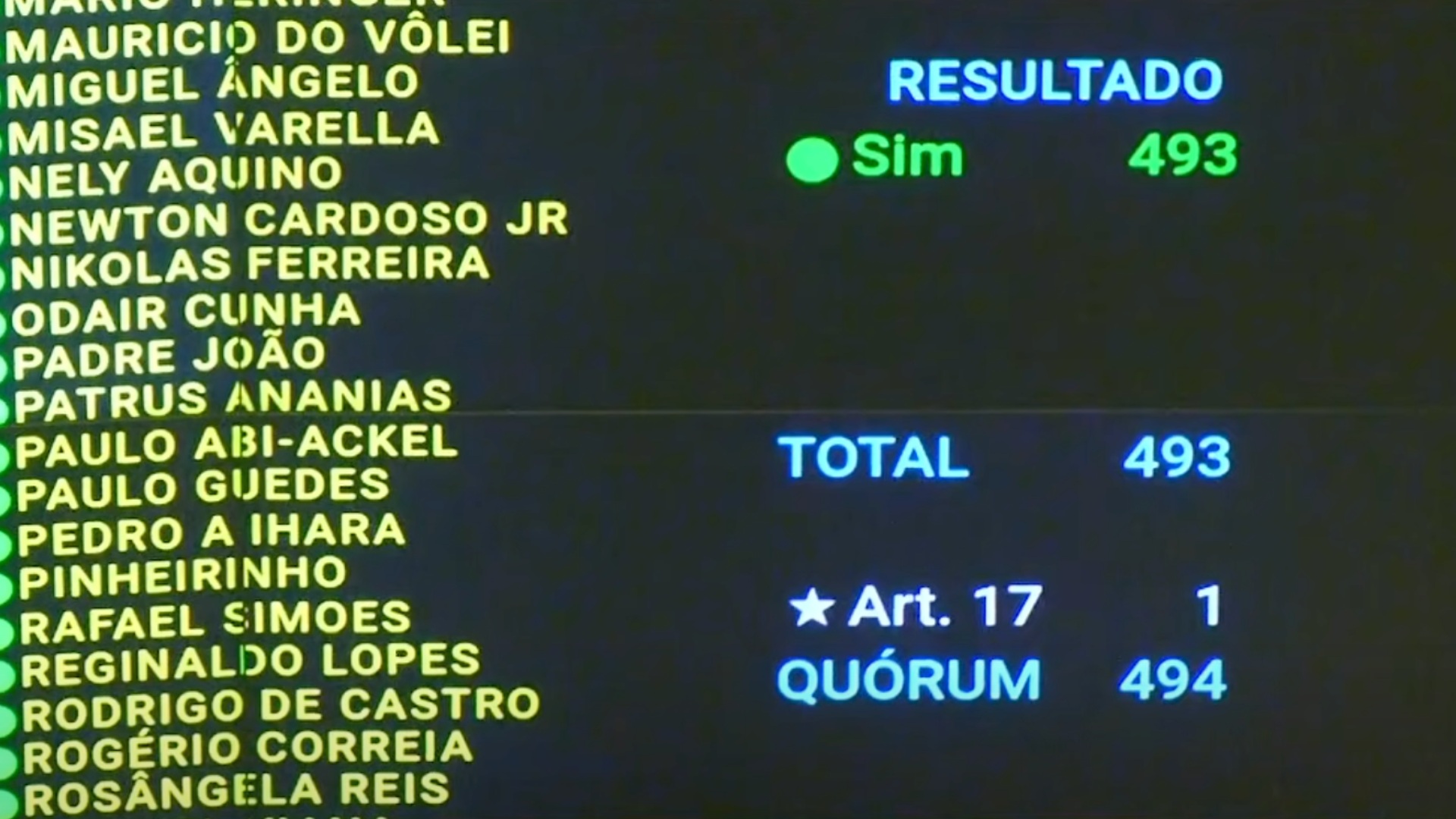 Na imagem, o placar da votação do IR na Câmara: 493 votos a favor e nenhum contra