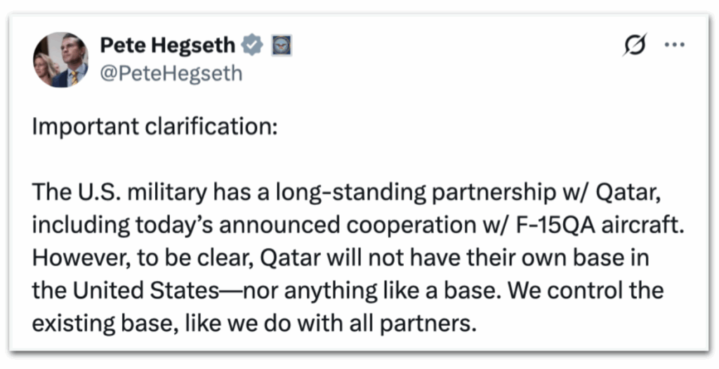 No X, Hegseth também declarou que o controle da base será norte-americano. “Esclarecimento importante: As Forças Armadas dos Estados Unidos mantêm uma parceria de longa data com o Qatar, incluindo a cooperação anunciada hoje envolvendo aeronaves F-15QA. No entanto, para ficar claro, o Qatar não terá sua própria base nos Estados Unidos –nem nada parecido com uma base. Nós controlamos a base existente, assim como fazemos com todos os parceiros”, escreveu.