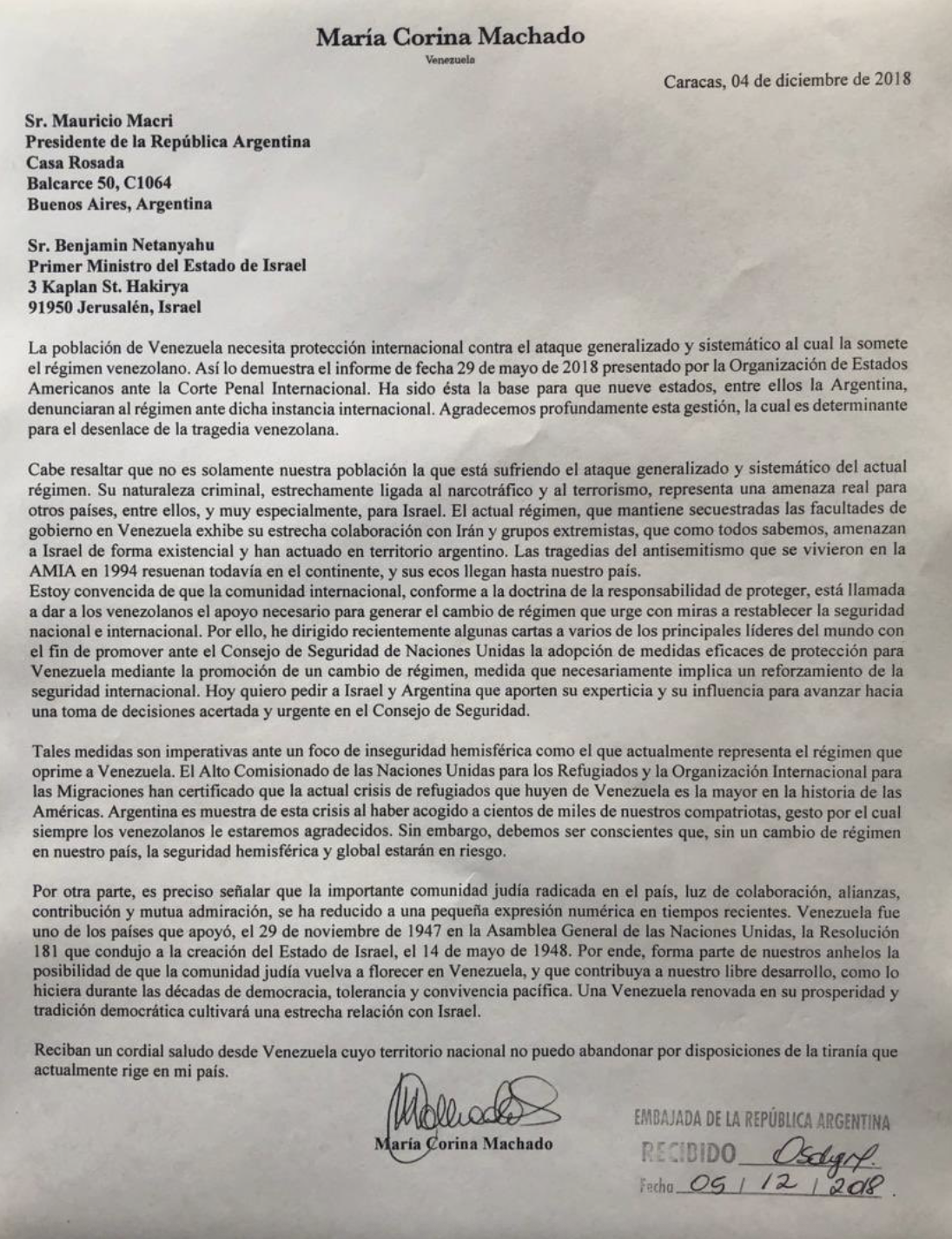 Eis a carta publicada pela líder da oposição venezuelana em 2018: