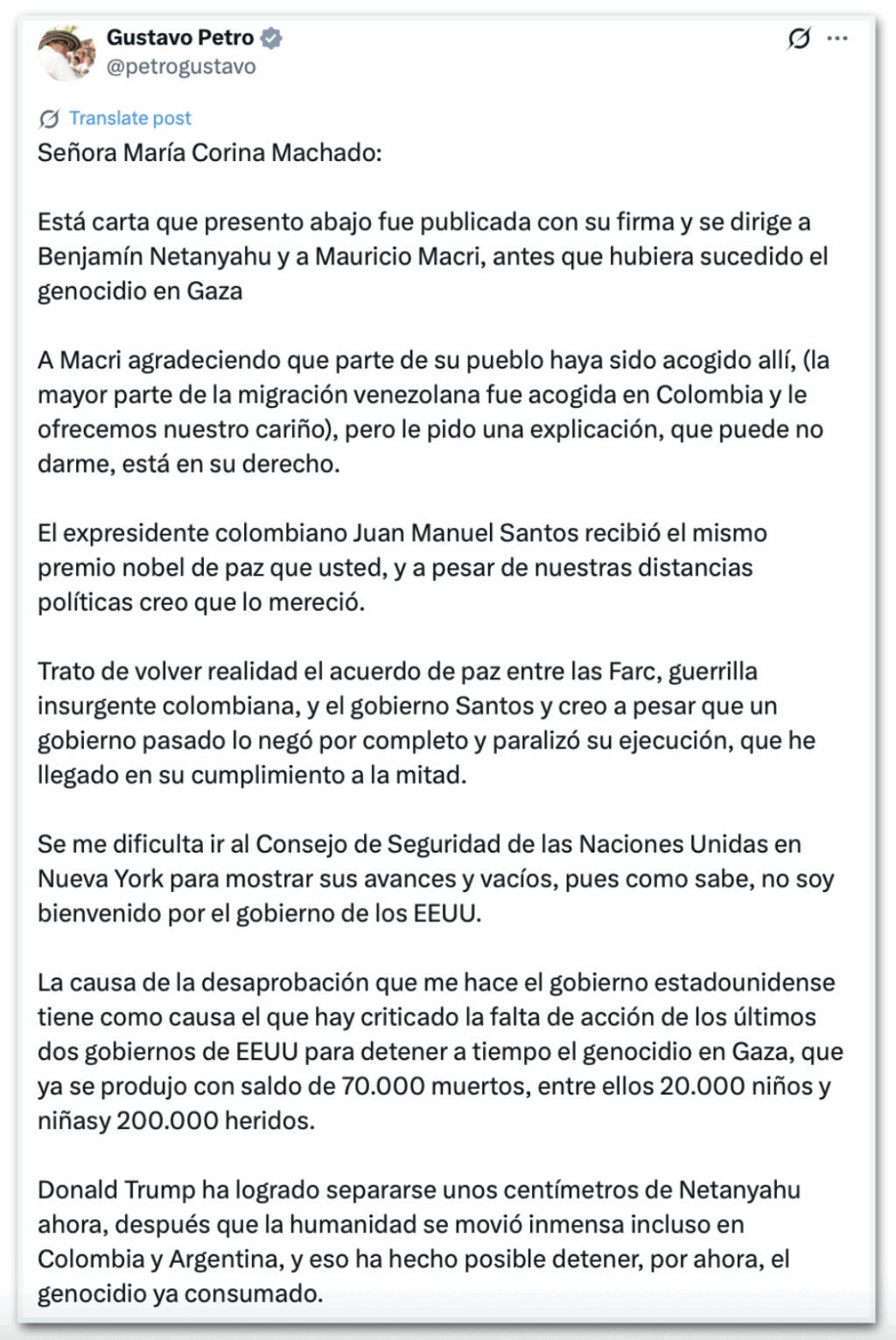 “Donald Trump conseguiu se distanciar alguns centímetros de Netanyahu agora, depois que a humanidade deu um grande passo, até mesmo na Colômbia e na Argentina, e isso tornou possível deter, por enquanto, o genocídio já em andamento”, declarou Petro.
