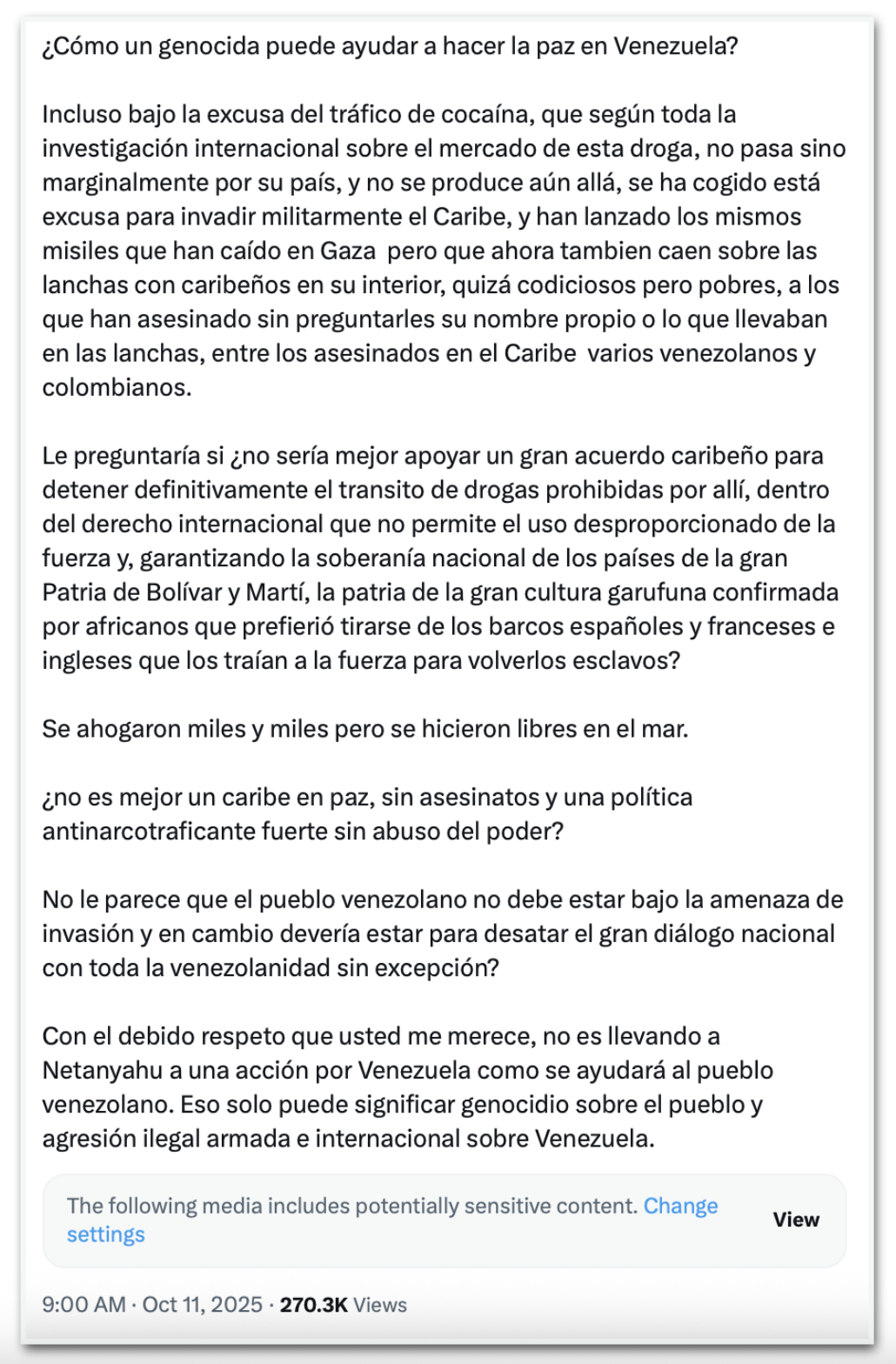 Defensor de que há um genocídio em Gaza provocado por Israel, Petro compartilhou uma postagem antiga de Corina, feita em dezembro de 2018, com uma carta destinada ao primeiro-ministro de Israel, Benjamin Netanyahu, e ao ex-presidente da Argentina Mauricio Macri.