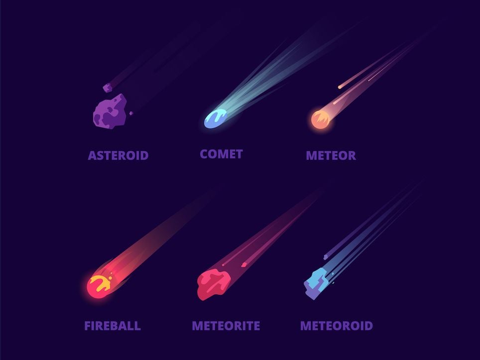Basicamente, são fragmentos de rocha, gelo ou metal, sendo a principal diferença a sua composição e o seu aspecto quando observados. Os asteroides são tipicamente rochosos, enquanto os cometas são uma mistura de gelo e poeira. E os meteoros são fragmentos muito menores que estes corpos.