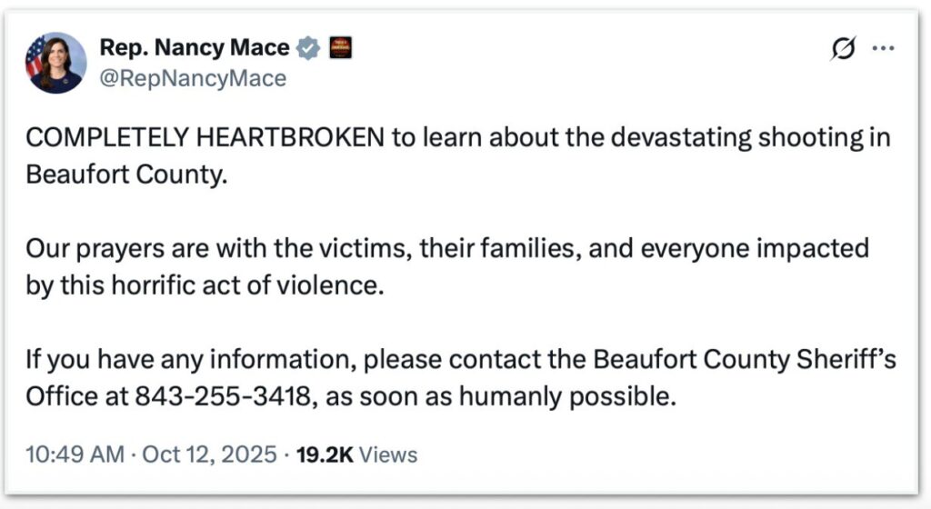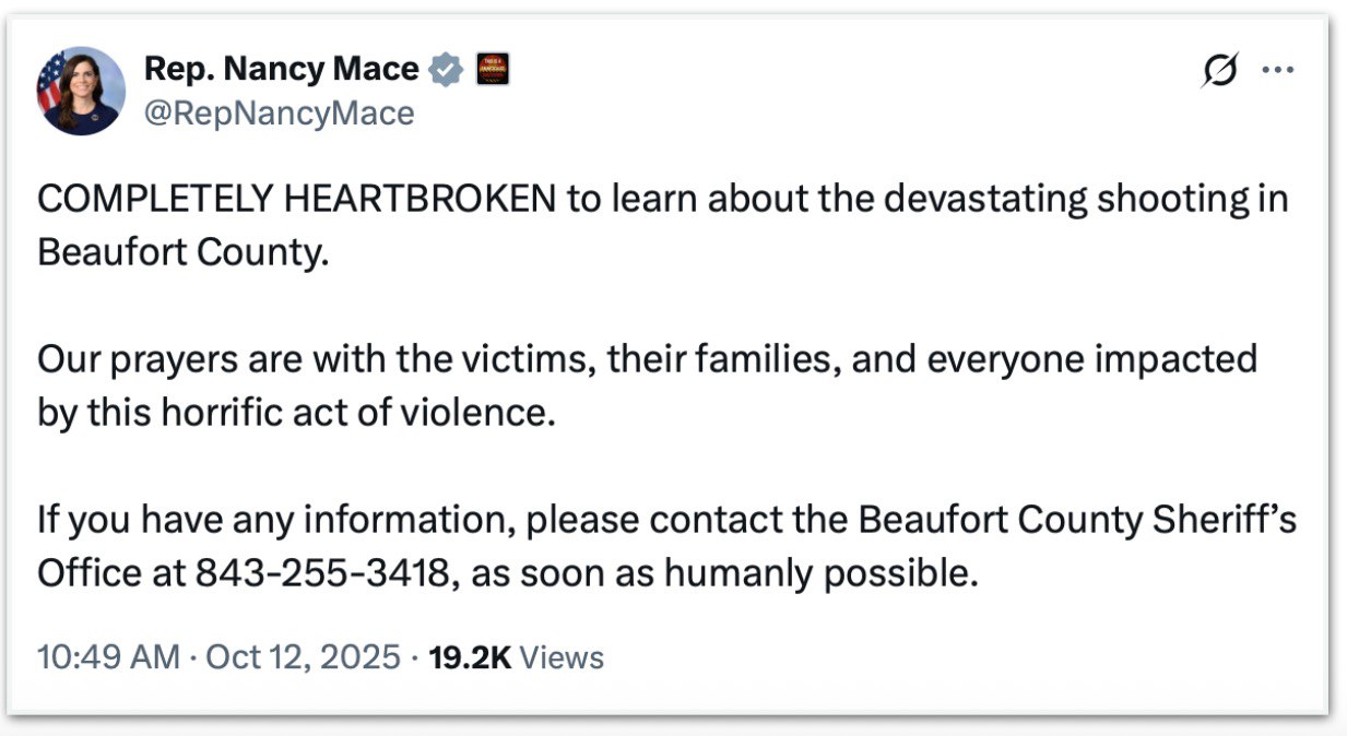 “COMPLETAMENTE DE CORAÇÃO PARTIDO ao saber sobre o devastador tiroteio no Condado de Beaufort. Nossas orações estão com as vítimas, suas famílias e todos os impactados por este horrível ato de violência”, escreveu a deputada da Carolina do Sul Nancy Mace (Partido Republicano).