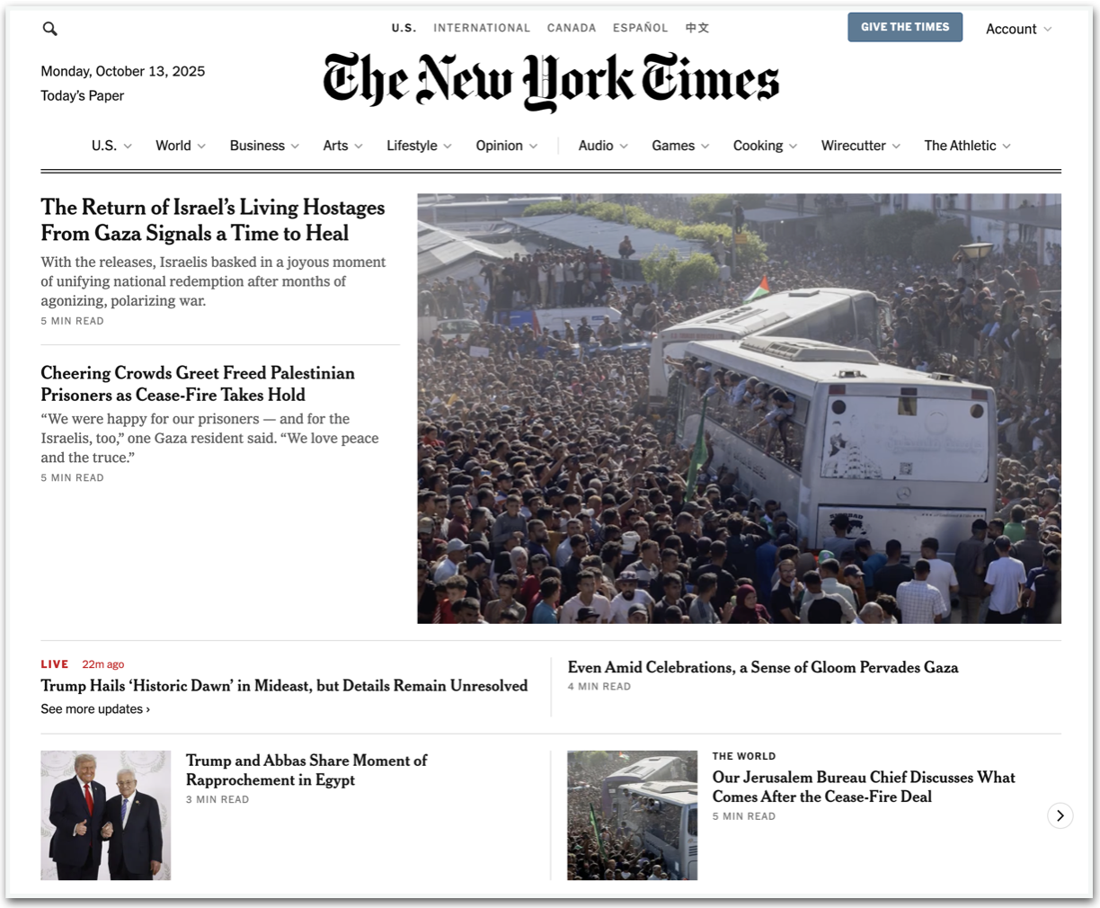 Já a Reuters destacou a comoção dos palestinos: “Em Gaza, milhares de parentes, muitos chorando de alegria, se reuniram em um hospital onde ônibus trouxeram para casa alguns dos quase 2.000 prisioneiros e detidos palestinos que seriam libertados por Israel como parte do acordo”.