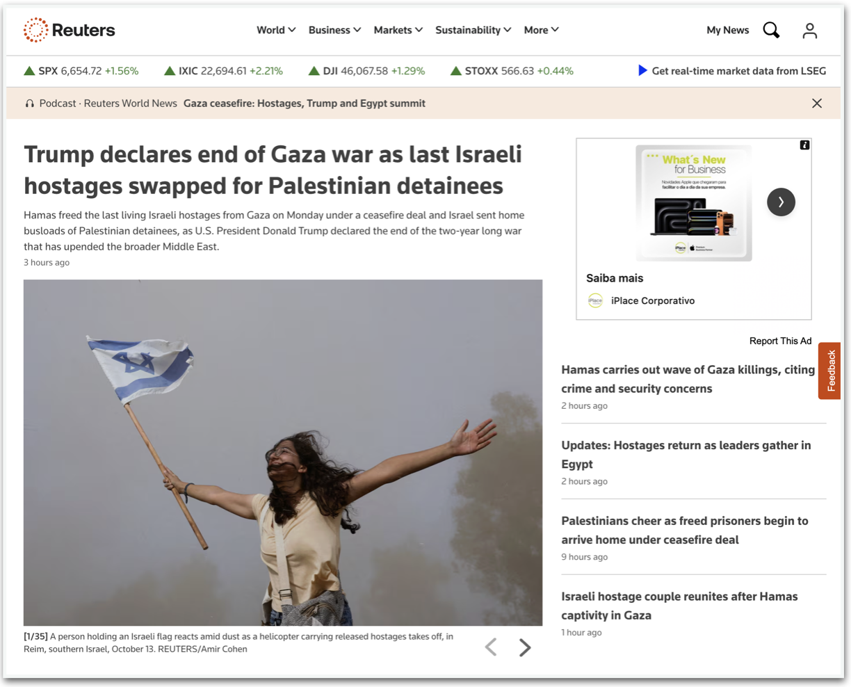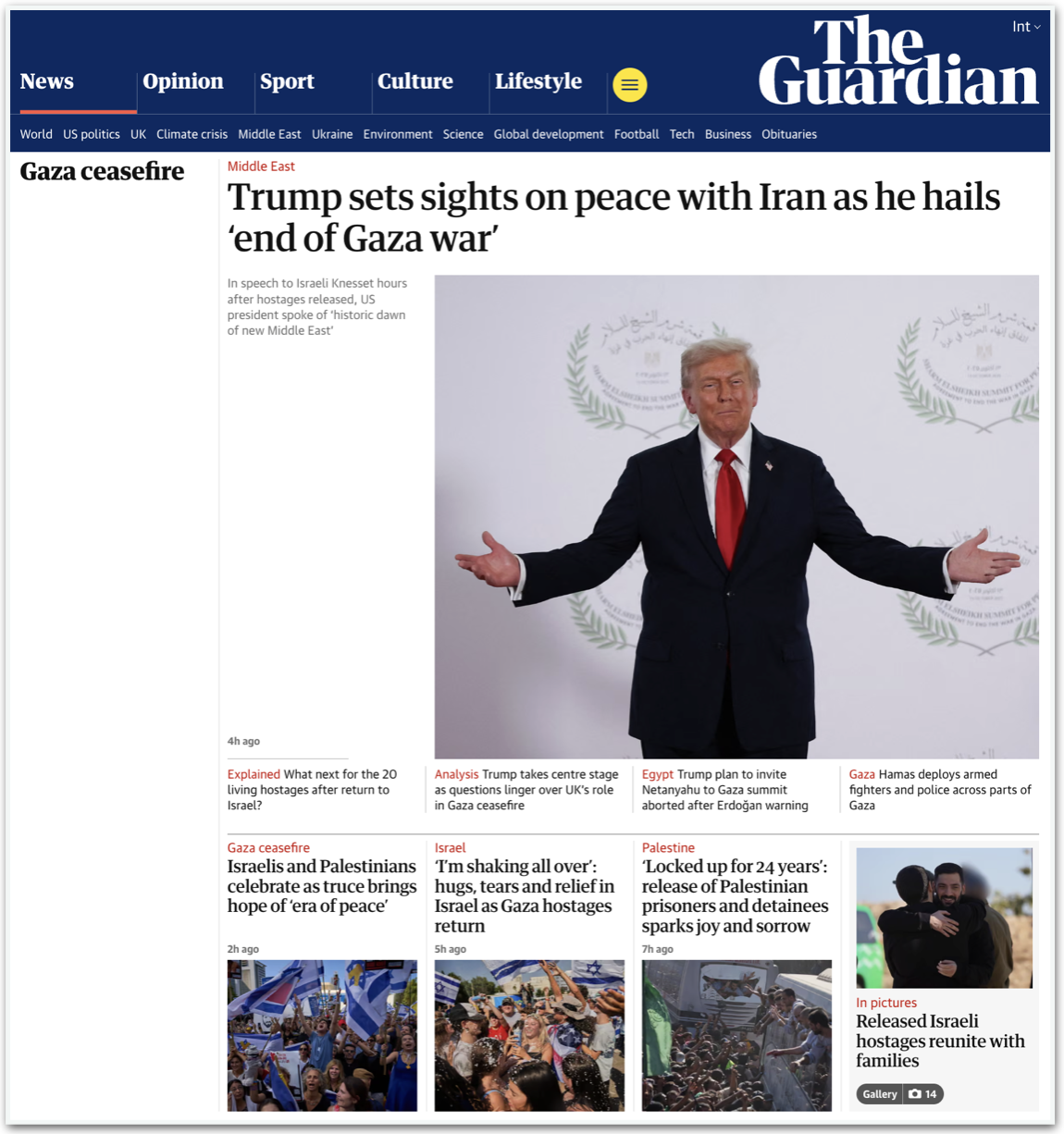 O cessar-fogo e a libertação dos reféns foi destaque na imprensa internacional nesta 2ª feira. Jornais como Guardian e El País e agências como Reuters e Associated Press trataram do fato como um avanço humanitário para o Oriente Médio. Os jornais também destacaram a participação de Trump na medida.