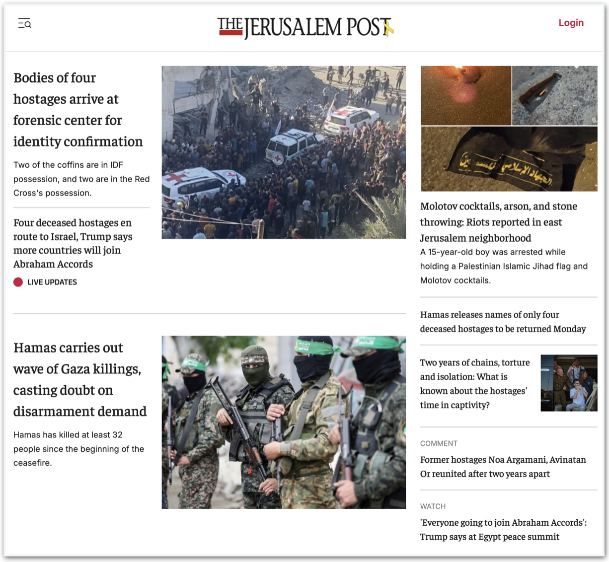 O jornal israelense Jerusalem Post criticou o que configura uma tentativa do Hamas de se “reafirmar em Gaza”. Para o veículo, o grupo extremista matou ao menos 32 pessoas “em uma repressão a grupos que resistiram ao seu forte controle sobre o enclave”, depois de o cessar-fogo ser estabelecido.
