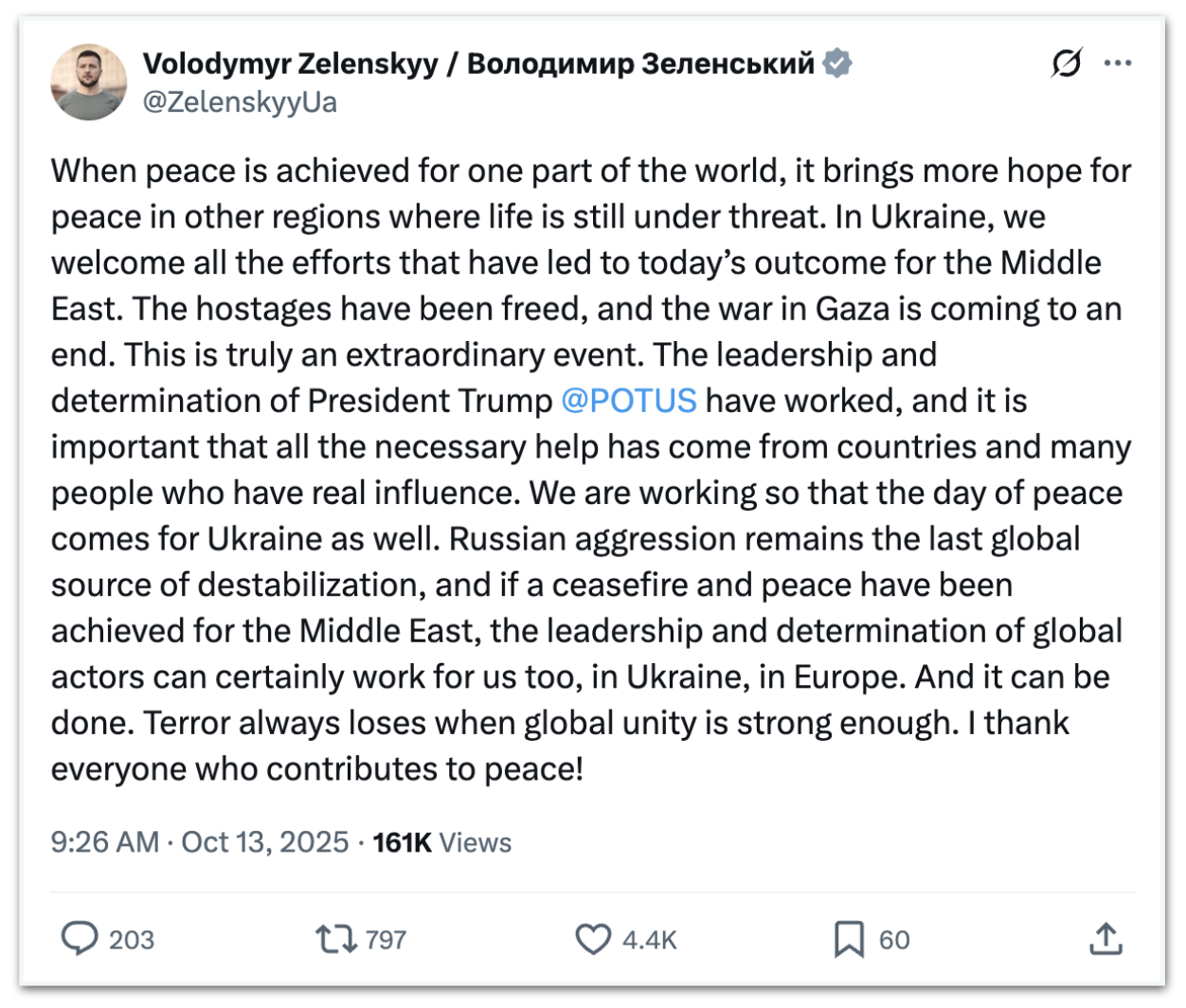 “Estamos trabalhando para que a paz chegue também para a Ucrânia. A agressão russa continua sendo a última fonte global de desestabilização. Se um cessar-fogo e a paz foram estabelecidos no Oriente Médio, a liderança e a determinação dos atores globais certamente podem funcionar para nós também, na Ucrânia, na Europa. E isso pode ser feito. O terror sempre perde quando a unidade global é forte o suficiente. Agradeço a todos que contribuem para a paz!”