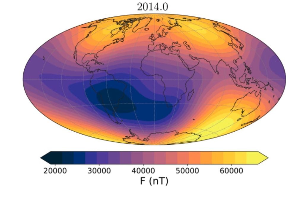 No entanto, esse escudo não é uniforme. Sabe-se há mais de um século que o campo magnético está enfraquecendo sobre o Atlântico Sul. Nessa área, as linhas magnéticas parecem se distorcer, enfraquecendo como se algo dentro da Terra as estivesse puxando para baixo.