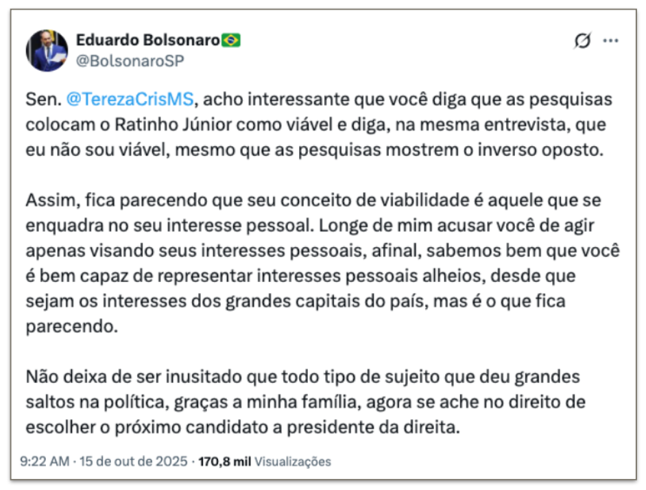 Eduardo também disse achar “inusitado que todo tipo de sujeito que deu grandes saltos na política, graças à minha família, agora se ache no direito de escolher o próximo candidato a presidente da direita”.