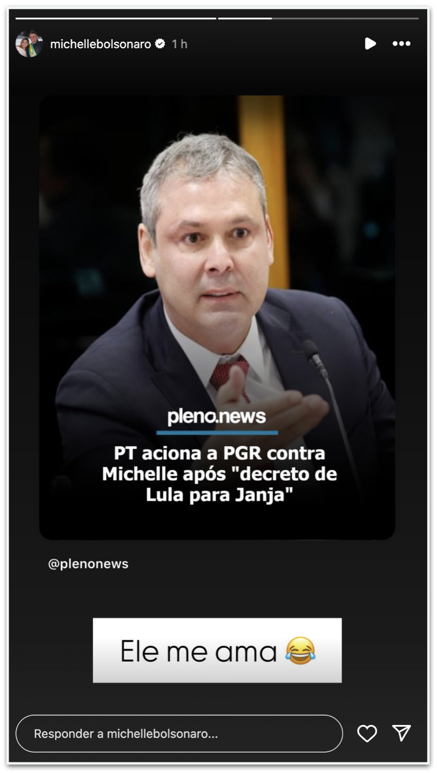 Na publicação, Michelle compartilhou uma notícia sobre o caso e escreveu: “Ele me ama”, acompanhado por um emoji de risada. Eis a íntegra da representação (PDF – 438 KB) protocolada por Lindbergh.