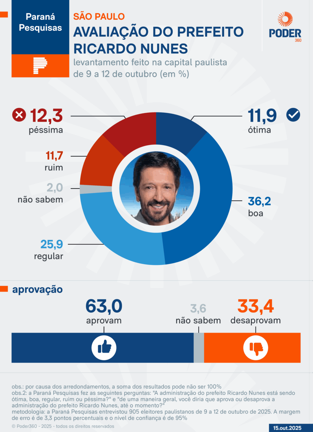 A Paraná Pesquisas entrevistou 905 eleitores na cidade de São Paulo de 9 a 12 de outubro de 2025. A margem de erro é de 3,3 pontos percentuais e o nível de confiança é de 95%.