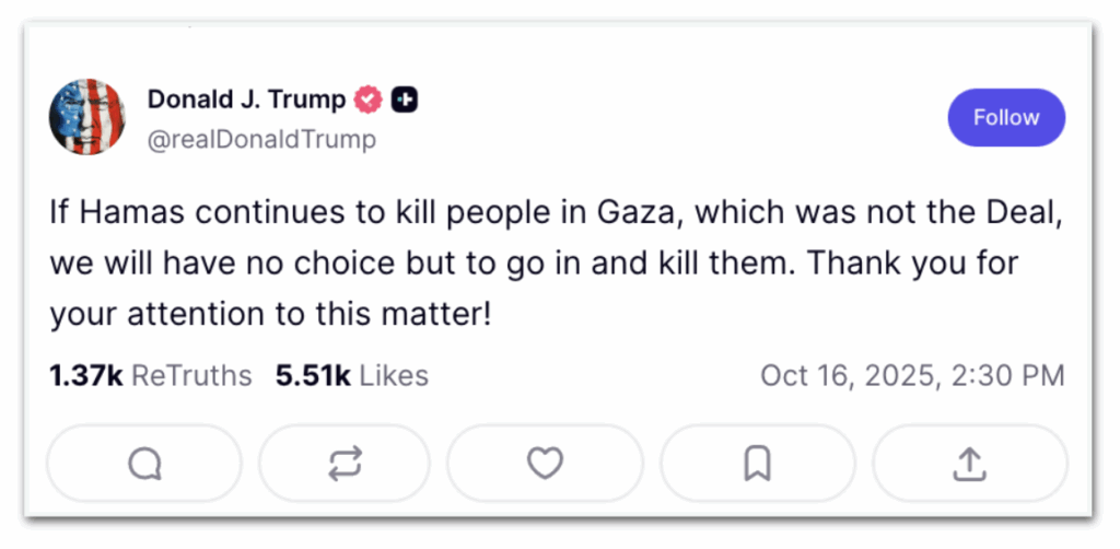 De acordo com publicação feita nesta 5ª feira (16.out.2025), o grupo estaria violando o cessar‑fogo. Desde que o acordo de paz foi firmado, em 10 de outubro, o grupo tem sido alvo de críticas por supostos ataques e execuções a grupos rivais em Gaza divulgados em redes sociais com a intenção de manter sua influência no território.