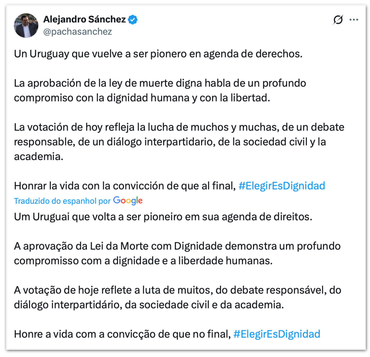 Autoridades uruguaias classificaram a aprovação como um marco histórico. O secretário da Presidência, Alejandro Sánchez, disse que o país “volta a ser pioneiro na agenda de direitos”. Políticos contrários à proposta criticaram a falta de garantias para pessoas vulneráveis e cobraram ampliação do acesso a cuidados paliativos.