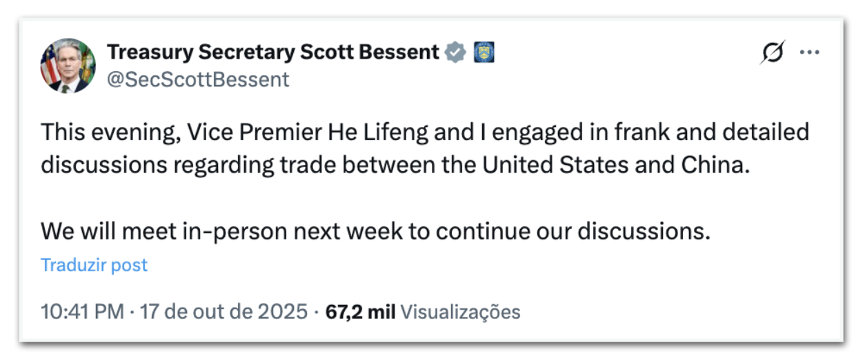 Bessent declarou também que ele e Lifeng vão se reunir presencialmente na próxima semana para retomar as discussões. Não deu uma data para o encontro. O anúncio ocorreu horas depois de Donald Trump (Partido Republicano) afirmar que vai se reunir com o presidente da China, Xi Jinping, na Coreia do Sul.