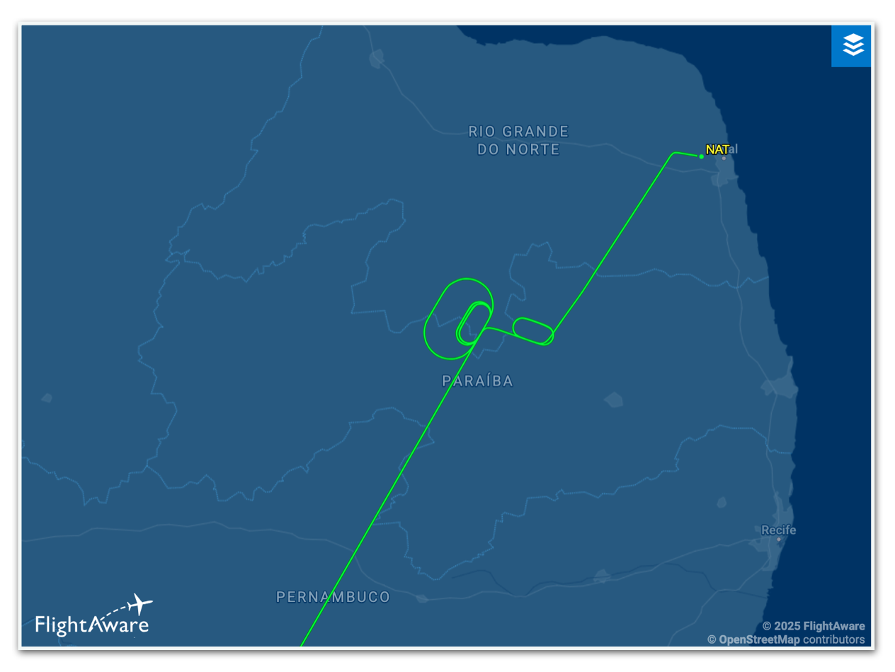 O voo 2594 da companhia Azul Linhas Aéreas –de Uberlândia (MG) com destino a Natal– precisou sobrevoar o espaço aéreo do Estado da Paraíba até a liberação da pista. Veja abaixo a rota de emergência do voo.