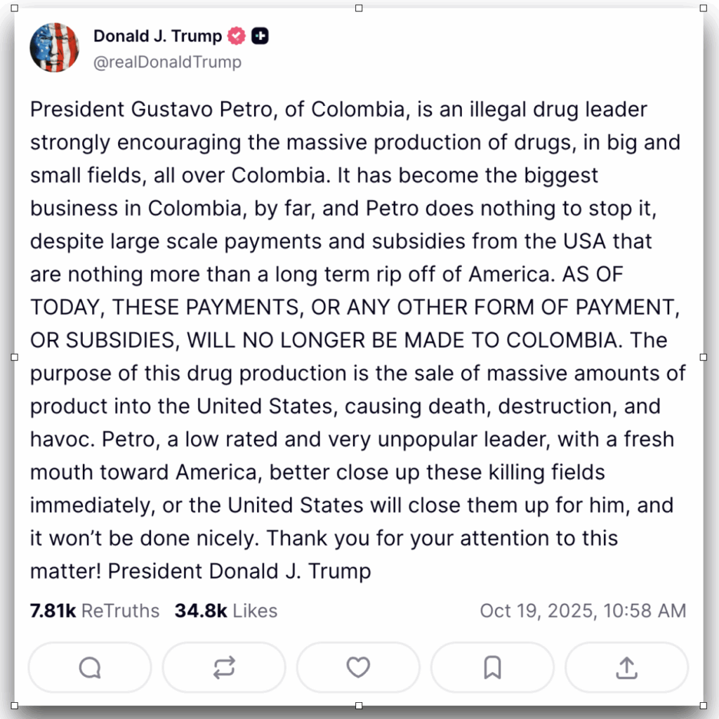 As declarações foram feitas no mesmo dia em que Petro acusou Washington de assassinato depois do ataque norte-americano em águas caribenhas , o 6º desde o início de setembro. Trump disse que Petro “não faz nada para deter” o tráfico e chamou o presidente colombiano de “impopular”.