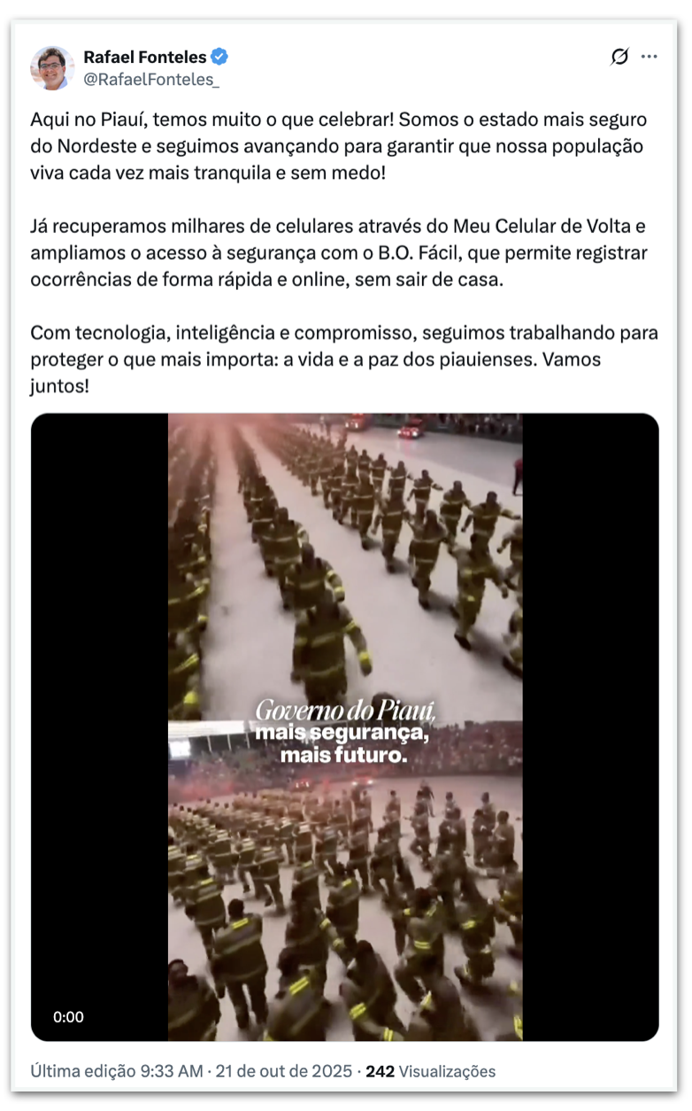 Nesta 3ª feira (21.out), Fonteles fez um novo post sobre o programa, mas sem citar o vídeo publicado anteriormente. “Somos o estado mais seguro do Nordeste e seguimos avançando para garantir que nossa população viva cada vez mais tranquila e sem medo!“, escreveu.