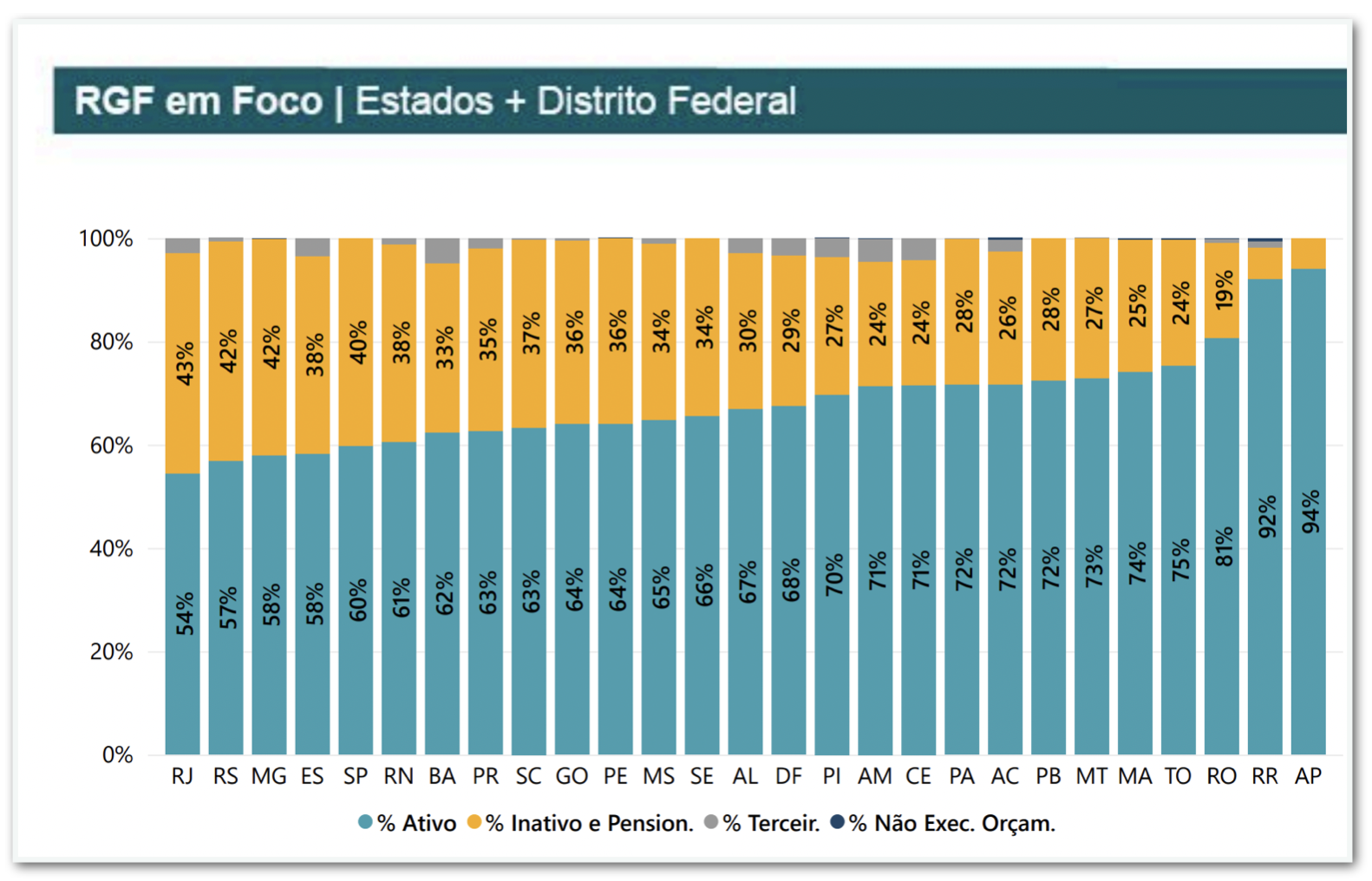 Os dados do relatório mostram que, ao considerar todos os Poderes e órgão, a composição da despesa bruta com pessoal varia de 54% a 94% em proporção de ativos.