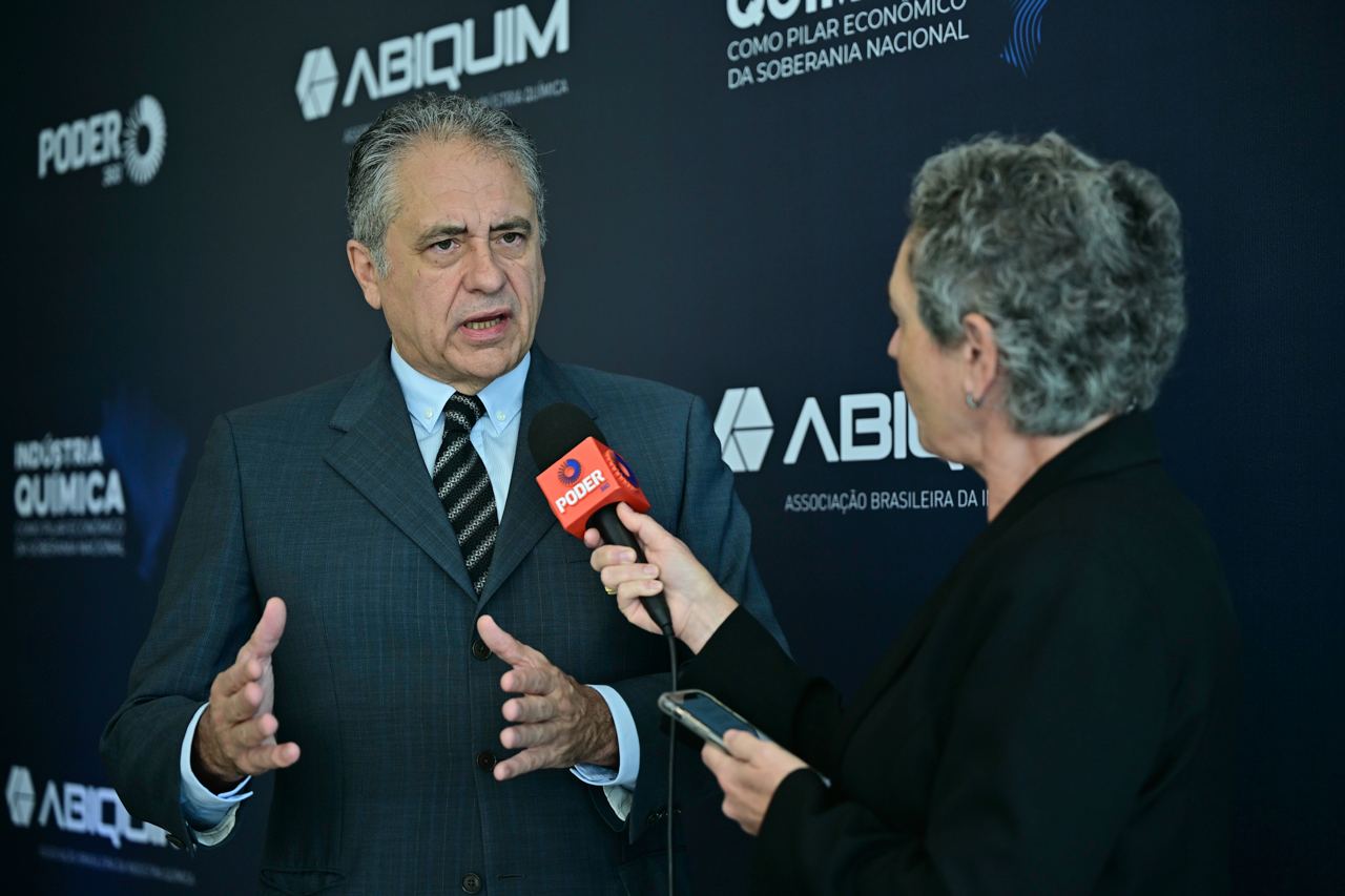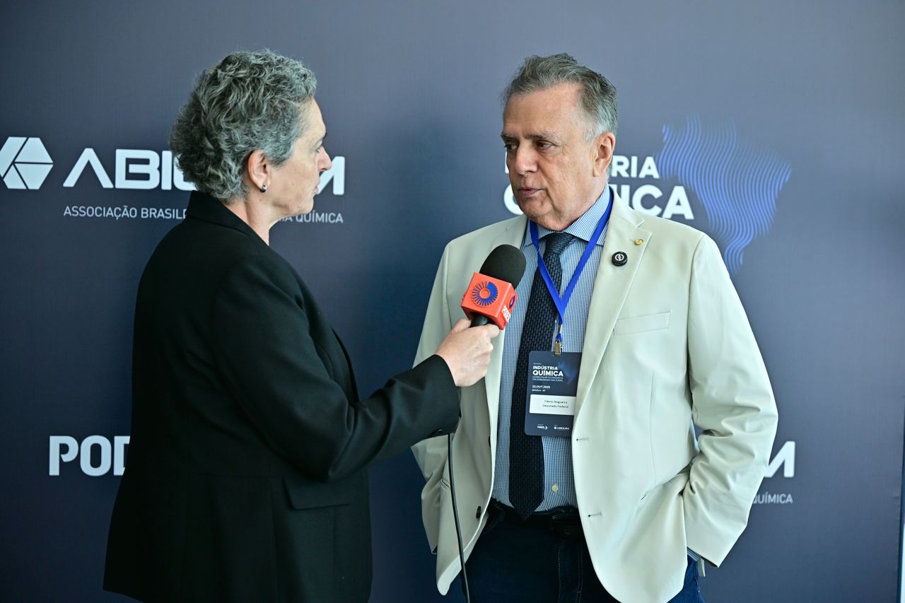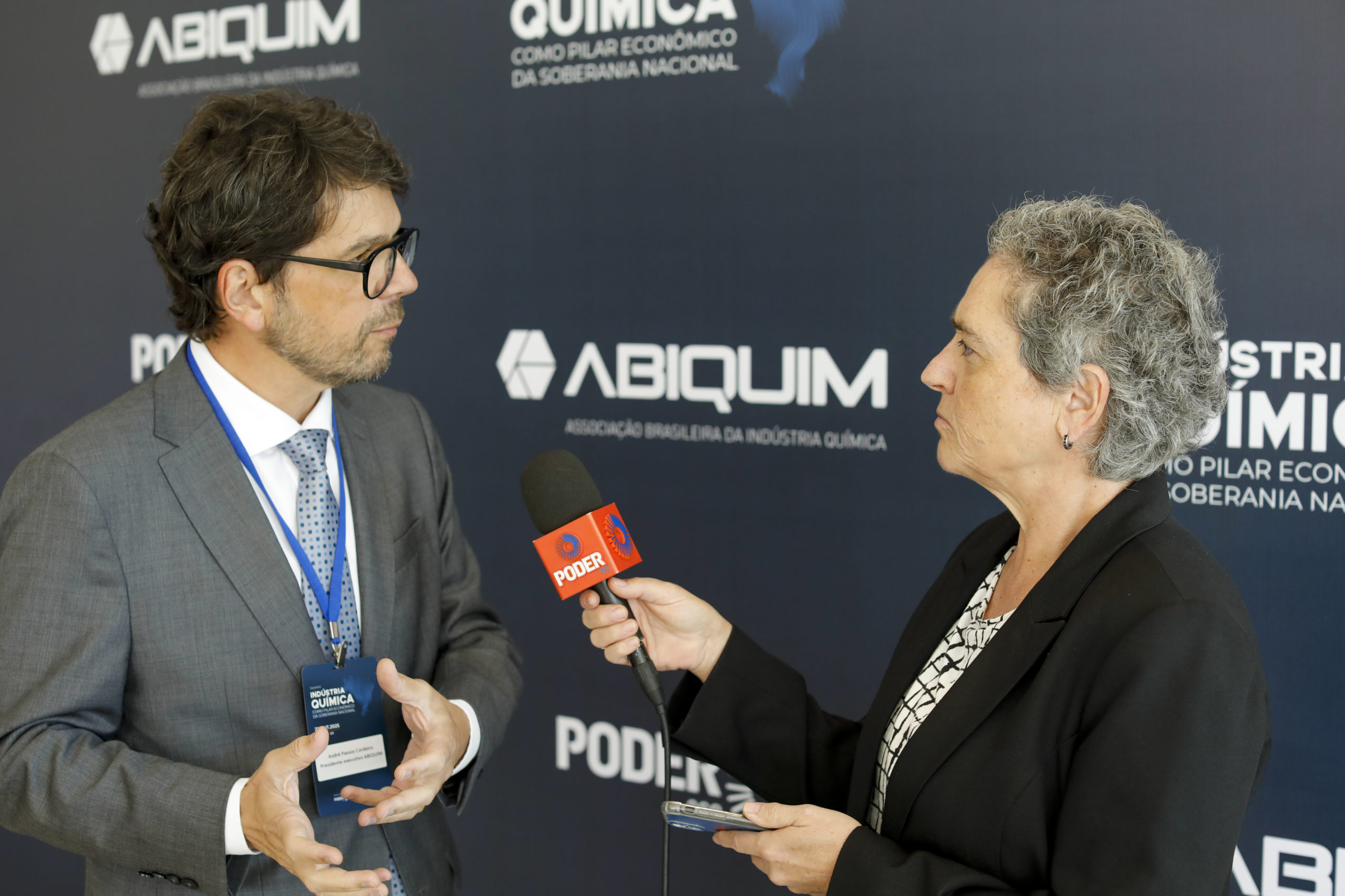 André Passos, presidente-executivo da Abiquim, fala à repórter Simone Kafruni, do Poder360, no seminário “Indústria química como pilar econômico da soberania nacional”