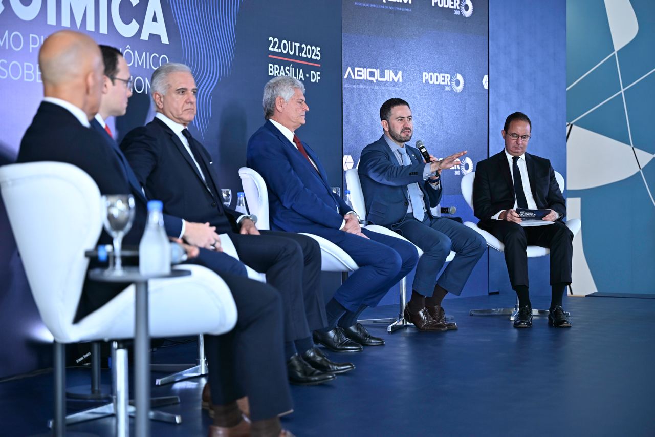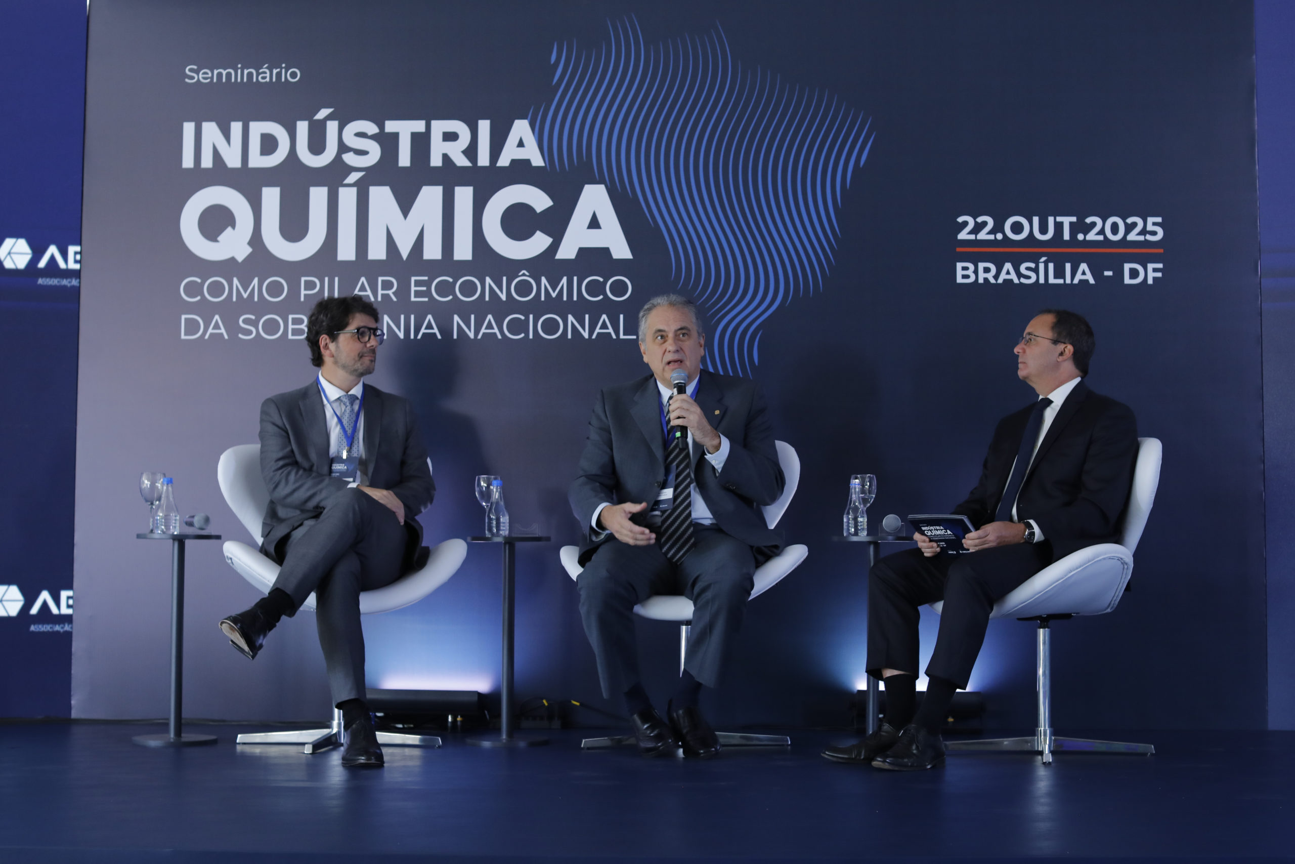 André Passos, presidente-executivo da Abiquim (esquerda), deputado Carlos Zarattini (PT-SP) e Paulo Silva Pinto, editor sênior do Poder360, no seminário “Indústria química como pilar econômico da soberania nacional”