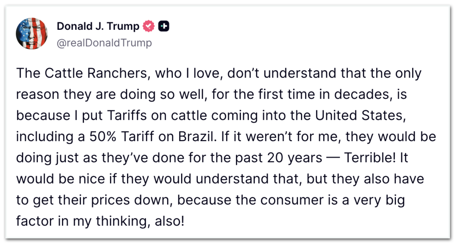 “Os pecuaristas, que eu amo, não entendem que a única razão pela qual estão indo tão bem, pela 1ª vez em décadas, é porque eu impus tarifas sobre o gado que entra nos Estados Unidos, incluindo uma tarifa de 50% sobre o Brasil. Se não fosse por mim, eles estariam fazendo exatamente o que têm feito nos últimos 20 anos –horrível! Seria bom se eles entendessem isso, mas eles também precisam reduzir os preços, porque o consumidor também é um fator muito importante na minha opinião!“, declarou.