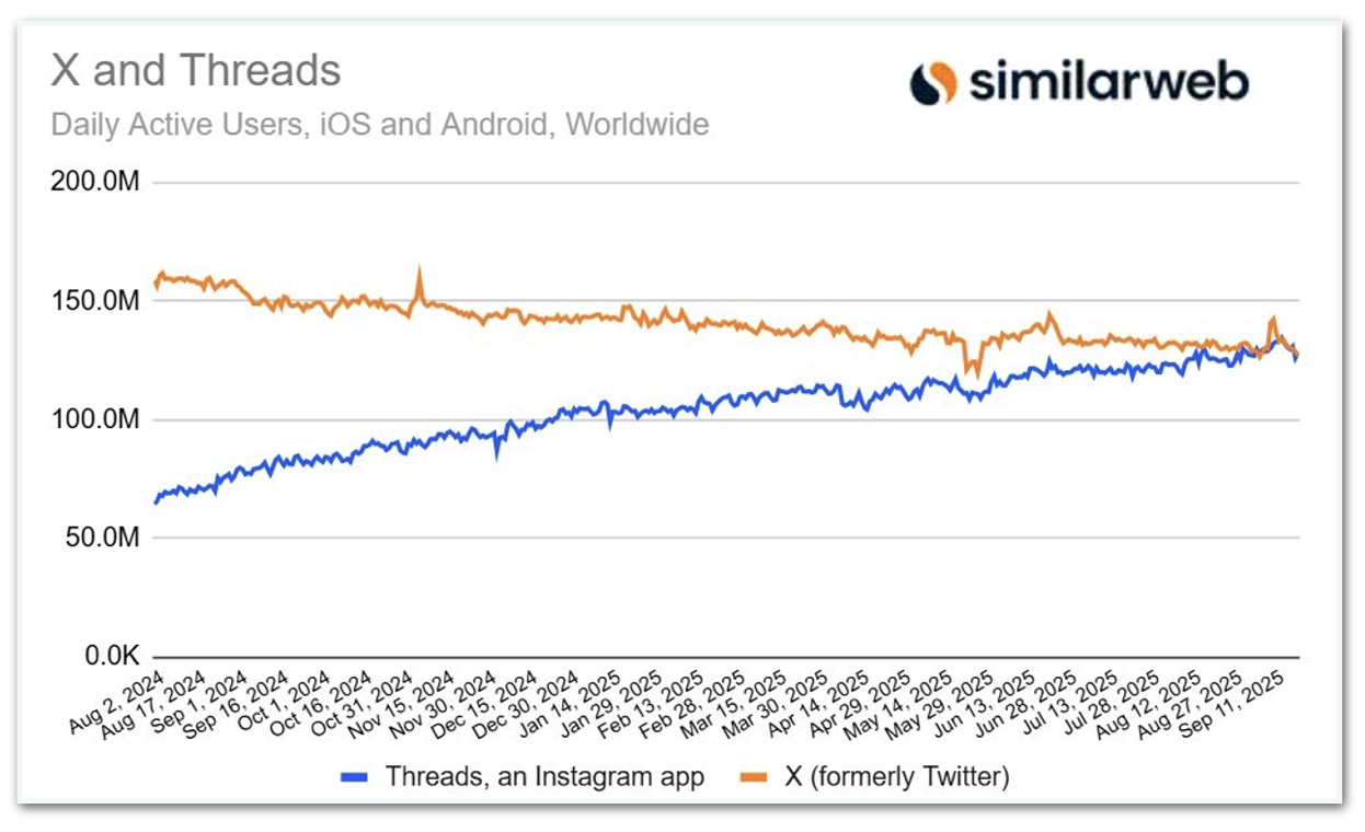 O Threads (em azul) já ultrapassou o X (amarelo) em usuários ativos em diversos dias nos meses de agosto e setembro de 2025